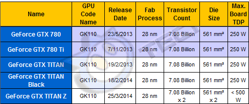 این تراشه در اوایل سال 2013 و با کالبدی تحت عنوان Geforce GTX TITAN 6GB ظهور کرد و تا ماه ها بدون رقیب بود . تنهای نقطه ضعف این مدل قیمت بسیار بالای آن بود ( 1000 دلار ) که بیشتر به دلیل 6GB حافظه گران قیمت GDDR5 در نظر گرفته برای آن بود. در اواخر سال 2013 میلادی کمپانی AMD مدل R9 290X RADEON را معرفی کرد که از نظر کارایی تقریبا مشابه GTX TITAN بود ولی با قیمتی به مراتب کمتر. البته در همین زمان کمپانی انویدیا GTX 780 3GB را که با حافظه کمتر و مشخصات فنی اندک ضعیفتر که با قیمت به مراتب ارزان تر ( 650 دلار ) از GTX TITAN به فروش می رسید را روانه بازار کرده بود.