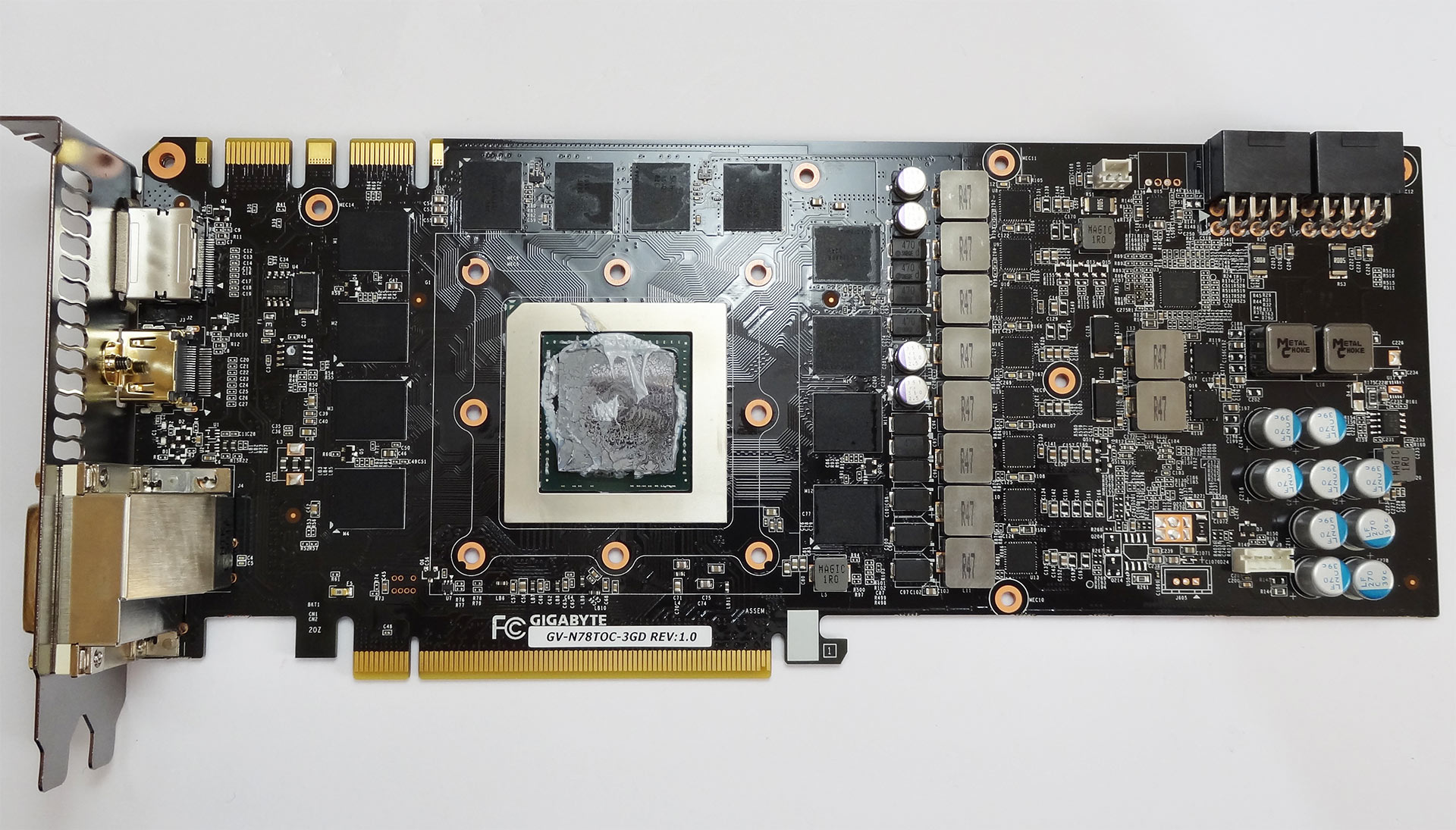 کمپانی گیگابایت در این مدل همانند مدل مرجع از چیپ های حافظه مدل H5GQ2H24AFR-R2C ساخت کمپانی کره ای SK Hynix استفاده کرده است. 12 عدد از این چیپ جمعاً 3GB حافظه GDDR5 با رابط 384Bit و فرکانس 1750MHz) 7000MHz موثر) را برای تغذیه GPU قدرتمند این مدل فراهم می کنند.