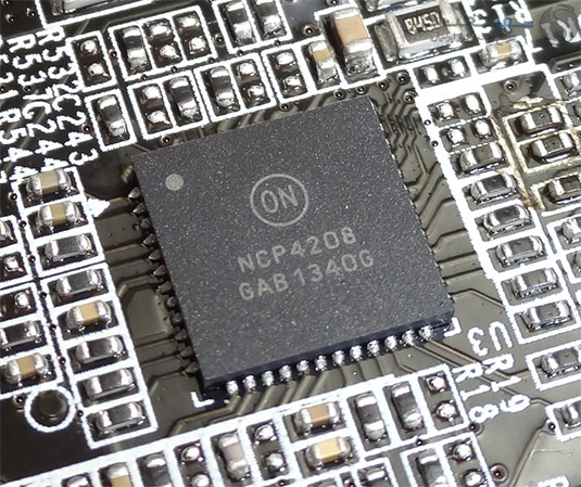 همانطور که اشاره شده چیپ PWM Controller به کار رفته در این مدل مدل مدل NCP4208 ساخت کمپانی ON Semiconductor می باشد. این چیپ بر خلاف کنترلر به کار رفته در مدل مرجع ( NCP4206 ) از نوع 8Phase با قابلیت پشتیبانی از استاندارد VRD 11.1 و تکنولوژی PSI برای مصرف بهینه انرژی در زمان های Idle می باشد.