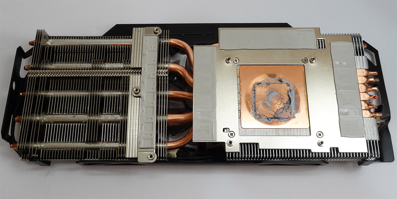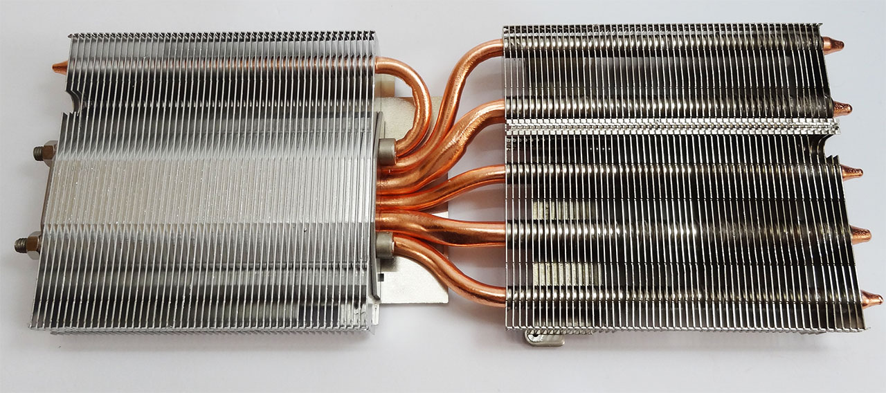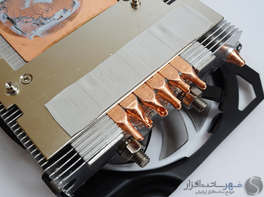 همانطور که ملاحظه می کنید 6 عدد Heat-Pipe در نظر گرفته شده برای این مدل گرما جذب شده از سطح GPU را به دو شبکه مجزا از تیغه های آلومینیومی منتقل می کنند .