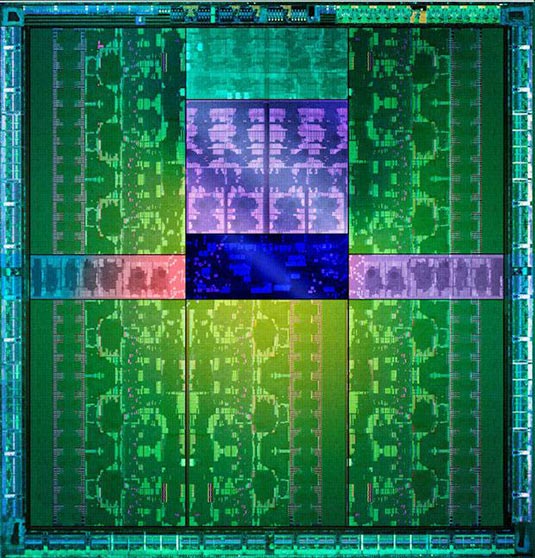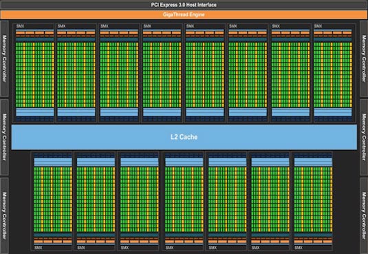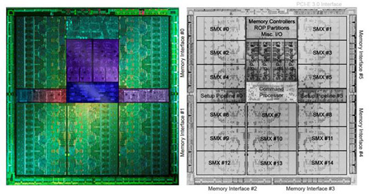 همانطور که در تصویر بالا ملاحظه می کنید، 5 قسمت سبز رنگی که در تصویر Die این GPU مشاهده می کنید GPC ( Graphic (Processing Cluster نامیده می شوند هر یک تشکیل دهنده 3 واحد SMX می باشند که روی هم رفته 15 عدد می شوند .همچنین 6 واحد کنترلر حافظه بر روی 3 ضلع این Die تعبیه شده اند که یه صورت عملی رابط 384bits با قابلیت پشتیبانی 6GB حافظه GDDR5 با فرکانس موثر 7GHz را برای این مدل فراهم کرده است. پهنای باندی که این کنترلر حافظه برای GK110 فراهم می کند به صورت تئوری به 336GB/s می رسد!