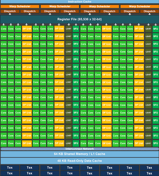 در تصویر بالا دیاگرام این GPU را ملاحظه می کنید . اما بگذارید برای ارائه توضیحات بیشتر بر روی یکی از این 15 به اصطلاح کلاسترهای SMX زوم کنیم.