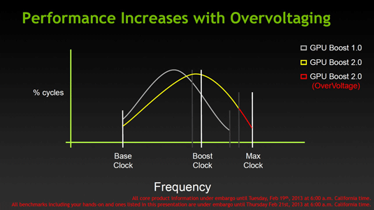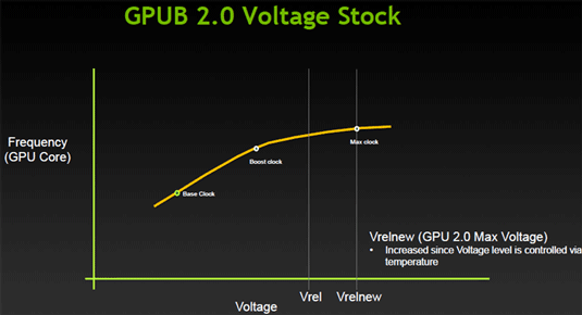 همانطور که در نسل اولیه GPU های مبتنی بر معماری Kepler نیز مشاهده کردید قابلیت GPU Boost تحت شرایطی خاص و کنترل شده و با در نظر گرفتن محدودیت های حرارتی و حداکثر توان مصرفی GPU، فرکانس هسته GPU را به صورت اندک افزایش می داد.