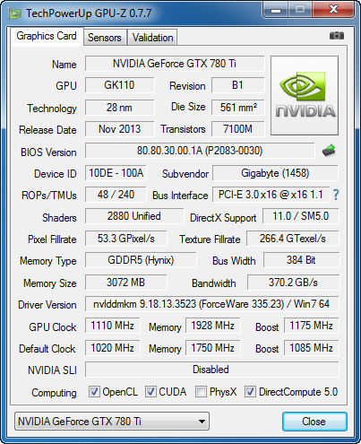 در تصویر زیر نیز مشخصات فنی GIGABYTE GTX 780 Ti WINDFORCE 3X 450W 3GB OC را از نگاه نرم افزار GPU-Z ملاحظه می کنید :
