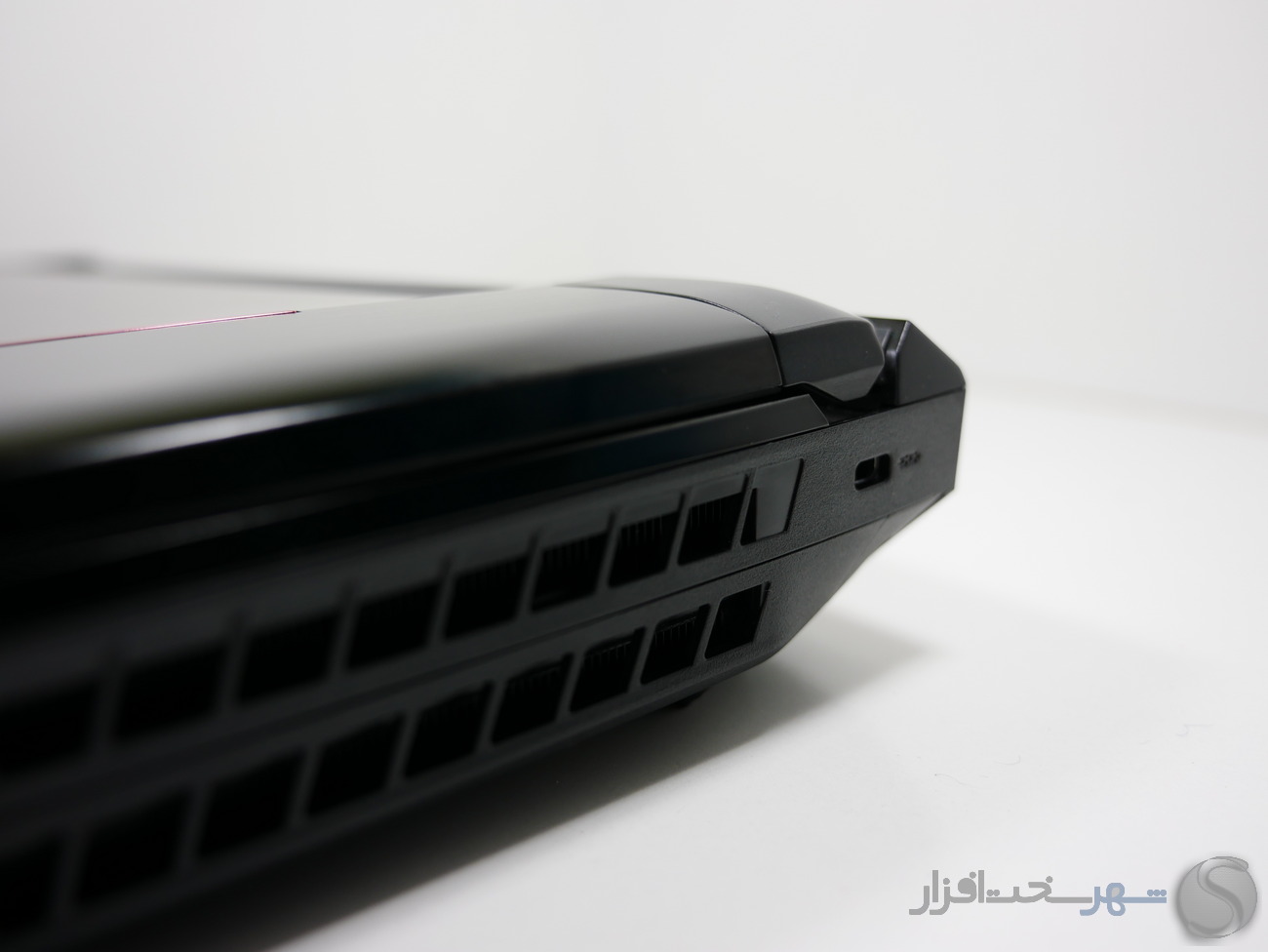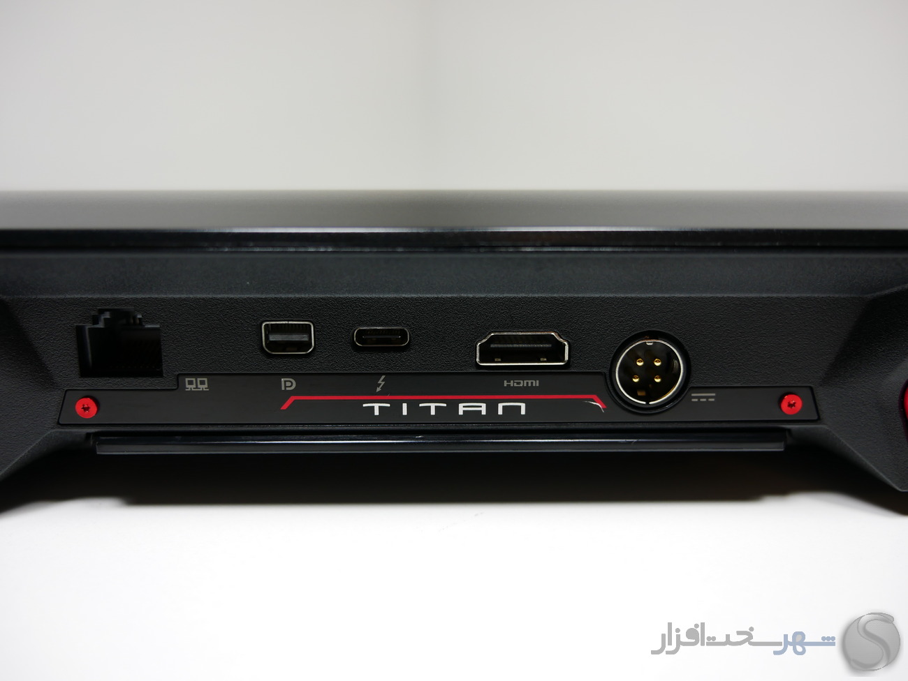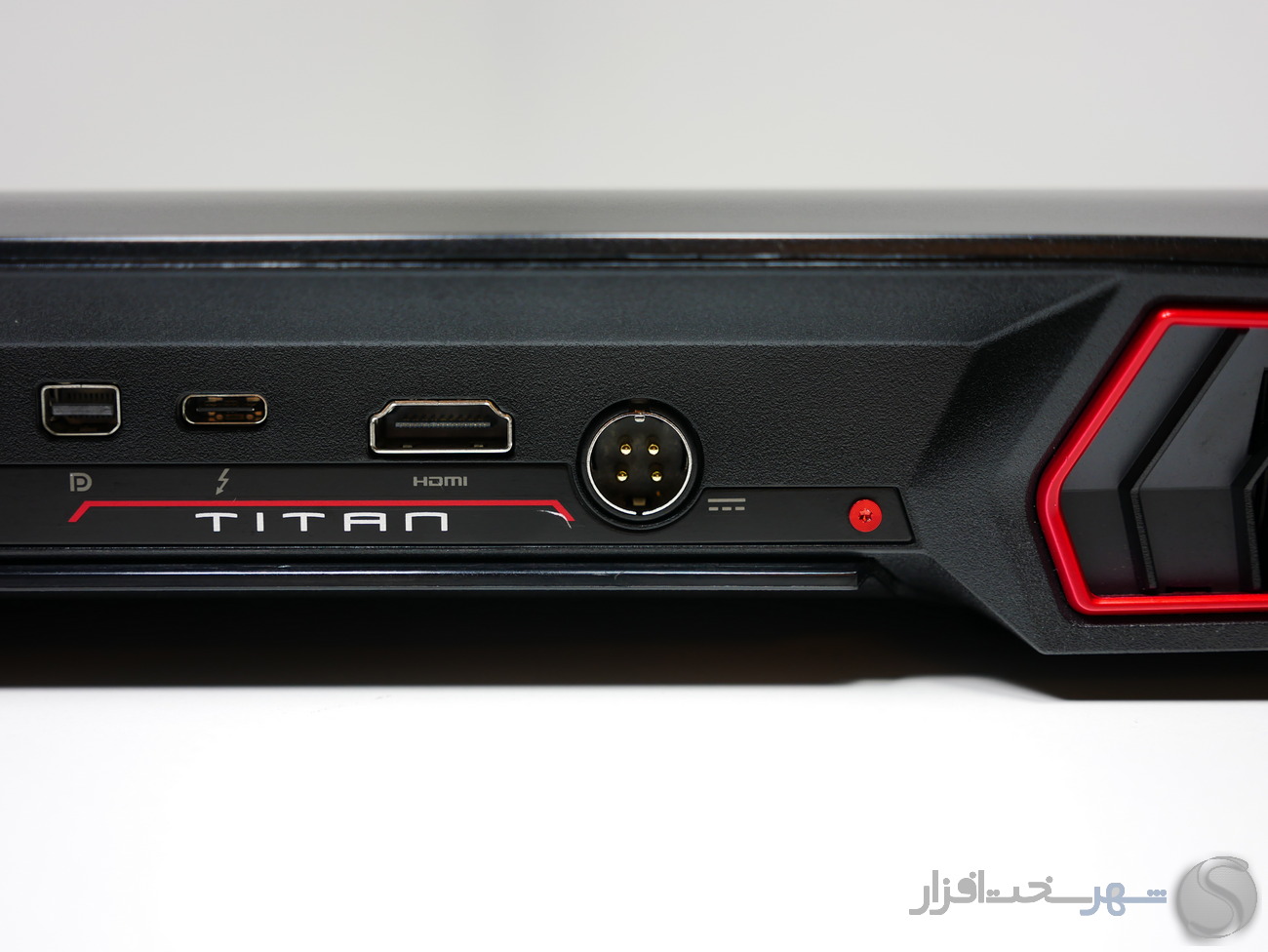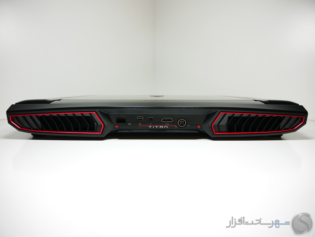 در نمای جلویی دستگاه هم تنها سه نشانگر LED برای باتری، هارد دیسک و شبکه بی سیم در نظر گرفته شده است. در نمای پشت محصول اما غوغاییست! این بخش به ظاهر الهام گرفته شده از خودروهای مسابقه ای، نمای بسیار خشن و جذابی را از دستگاه بیان می کند. دو خروجی گردش هوای فن با حاشیه ای قرمز رنگ زیبایی خاصی به دستگاه بخشیده اند. در میان آنها سوکت شبکه سیمی، پورت MiniDP برای اتصال نمایشگر، پورت ThunderBolt 3 برای اتصال نمایشگر یا هر ابزار دیگر، پورت HDMI و سوکت شارژر قرار گرفته اند.