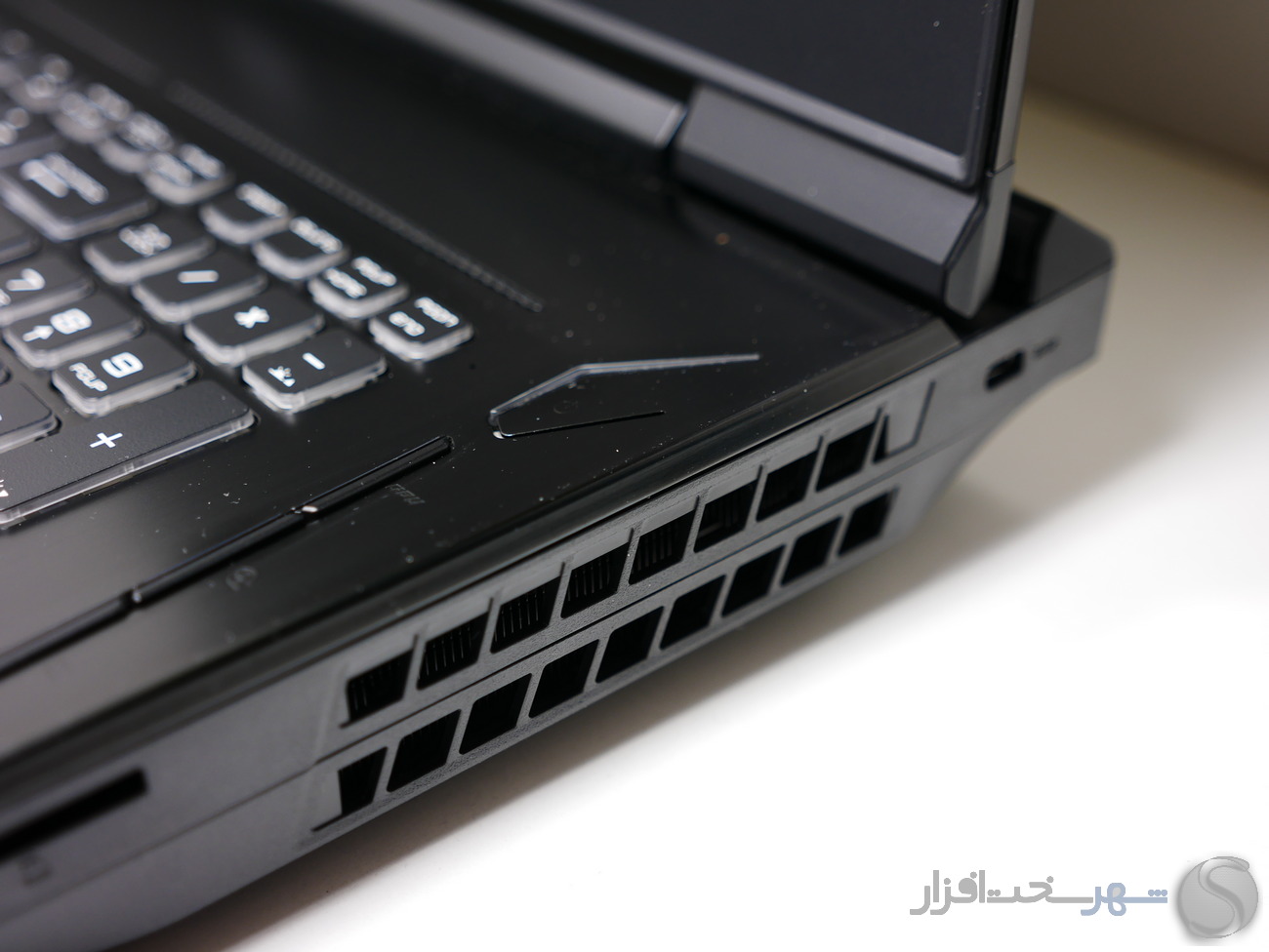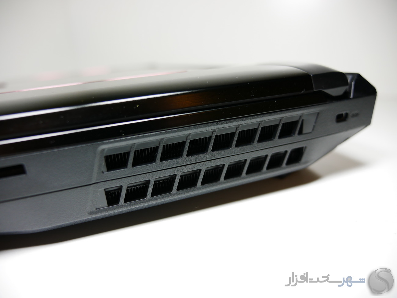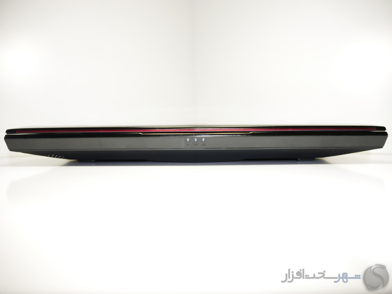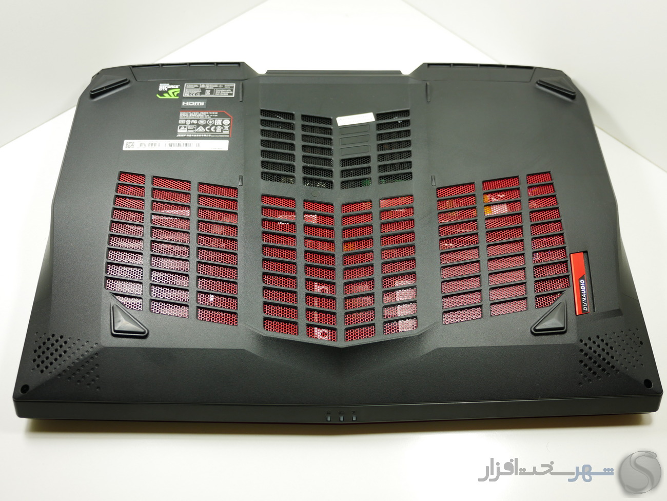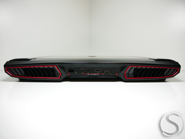 در نمای جلویی دستگاه هم تنها سه نشانگر LED برای باتری، هارد دیسک و شبکه بی سیم در نظر گرفته شده است. در نمای پشت محصول اما غوغاییست! این بخش به ظاهر الهام گرفته شده از خودروهای مسابقه ای، نمای بسیار خشن و جذابی را از دستگاه بیان می کند. دو خروجی گردش هوای فن با حاشیه ای قرمز رنگ زیبایی خاصی به دستگاه بخشیده اند. در میان آنها سوکت شبکه سیمی، پورت MiniDP برای اتصال نمایشگر، پورت ThunderBolt 3 برای اتصال نمایشگر یا هر ابزار دیگر، پورت HDMI و سوکت شارژر قرار گرفته اند.