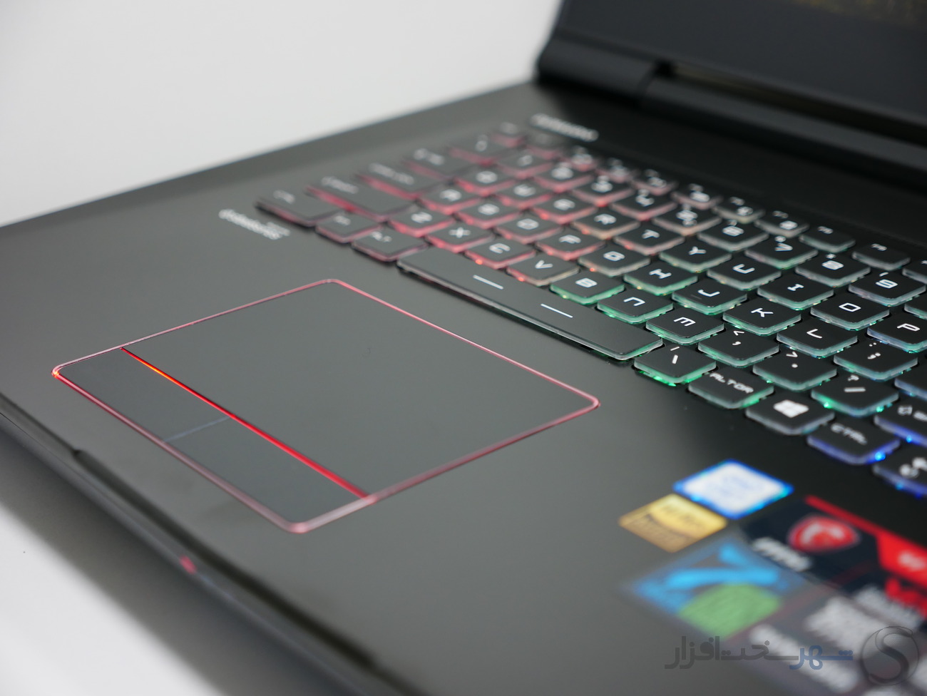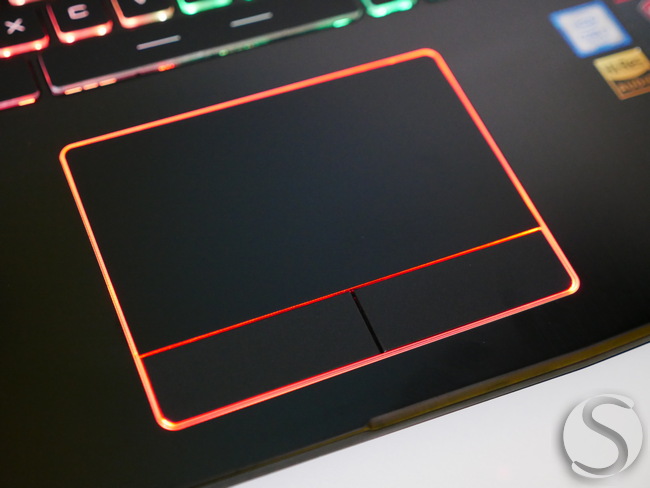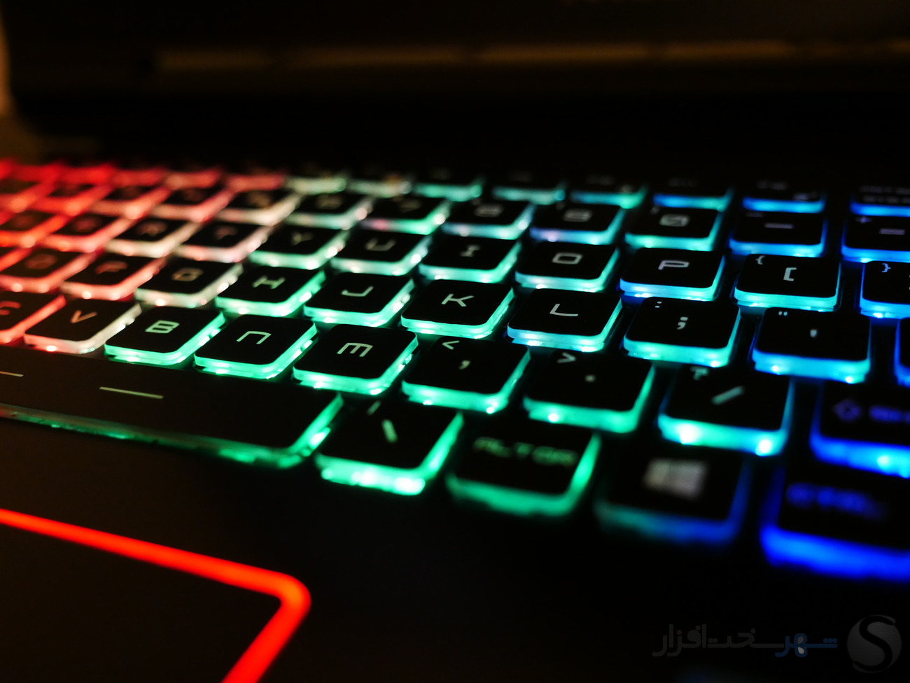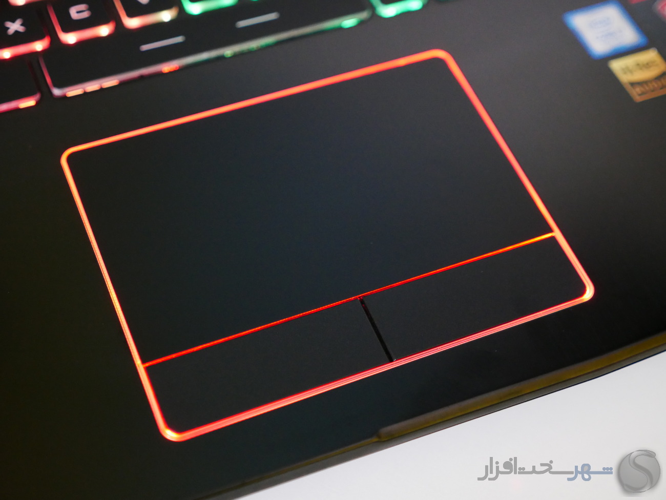 و اما تاچ پد این لپ تاپ نیز از نور RGB بی بهره نمانده است. حاشیه رنگی اطراف سطح تاچ پد و کلیدهای آن قابل تنظیم بوده و می توانید به هر رنگ دلخواهی آن را تنظیم کنید. سطح تاچ پد نیز بزرگ بوده و امکان استفاده از دستورات لمسی با چند انگشت نیز فراهم شده است.