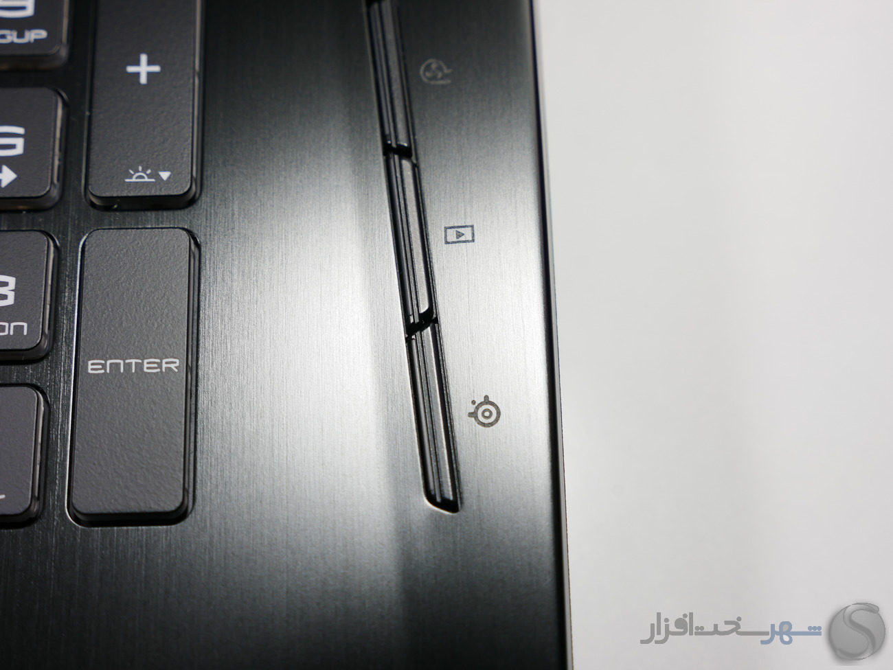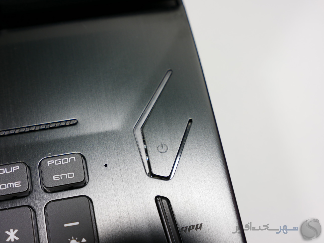 تعدادی دکمه کنترلی هم در بالا سمت راست کیبورد برای دسترسی و عملکرد راحت تر قرار داده شده اند. دکمه Power، دکمه سوییچ بین کارت گرافیک های اصلی و مجتمع، حالت توربو فن، اپلیکیشن اختصاصی از پیش تعریف شده و همچنین کلید اختصاصی برای تغییر پروفایل های رنگ نور پس زمینه کیبورد.