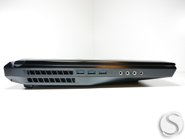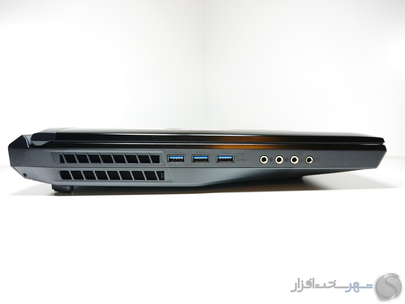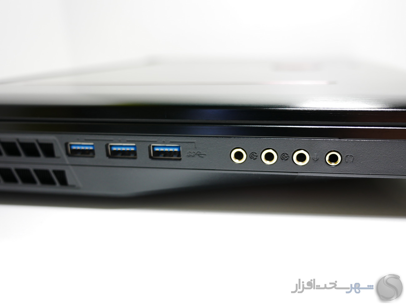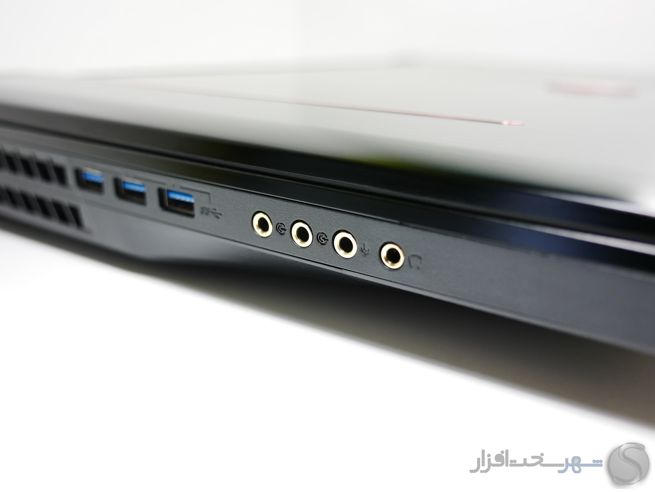 در لبه ی چپ نیز سه پورت USB3.0، سه جک 3.5 میلیمتری مربوط به ورودی و خروجی های صدا و خروجی هوای فن تعبیه شده است.