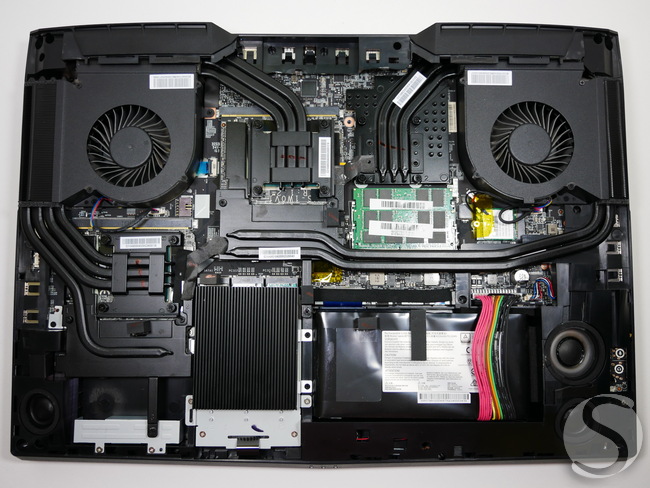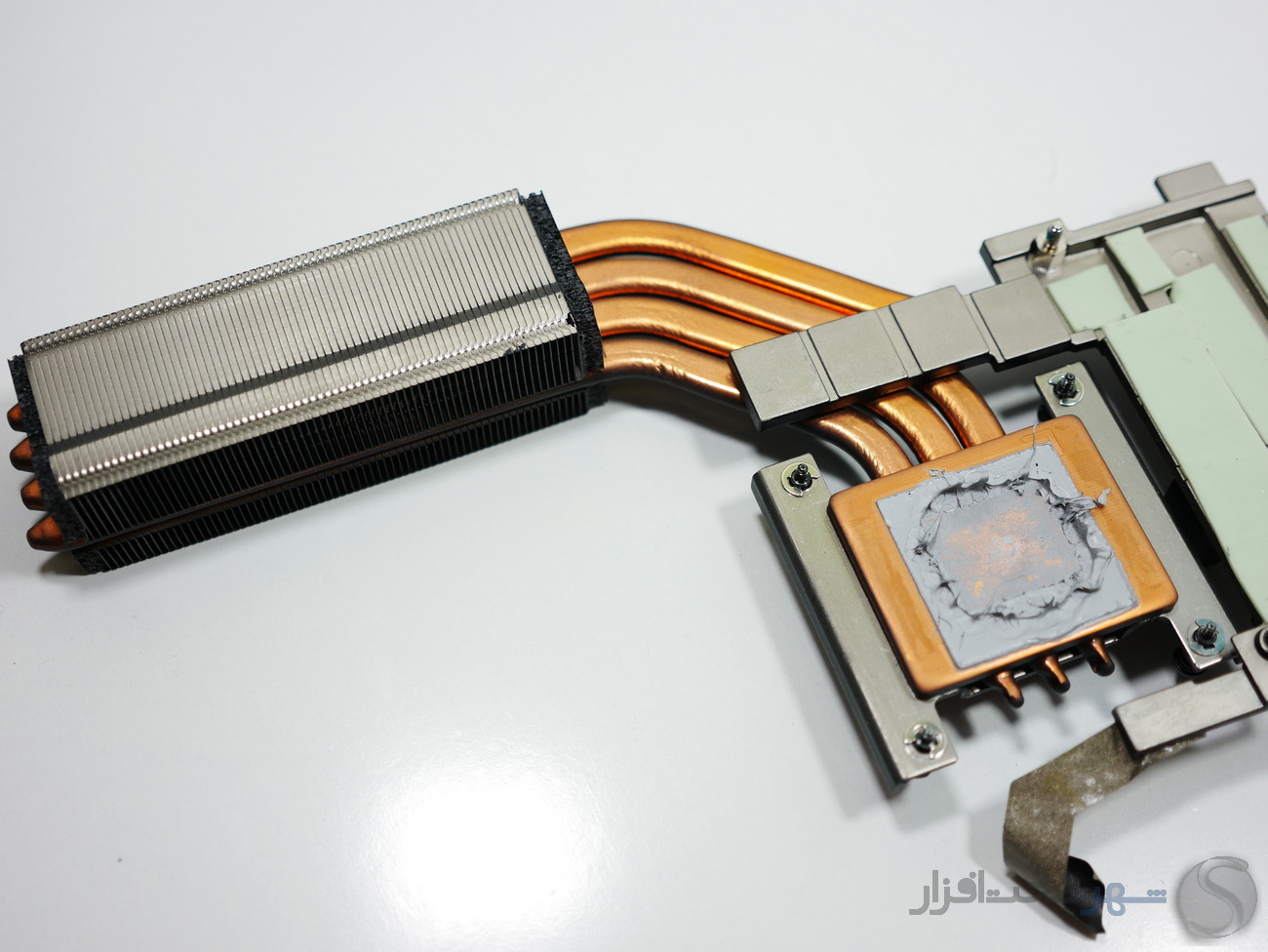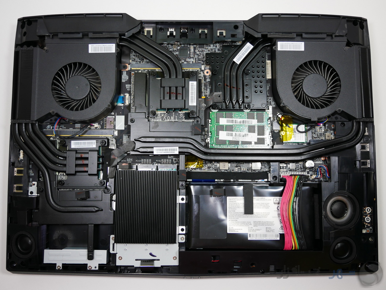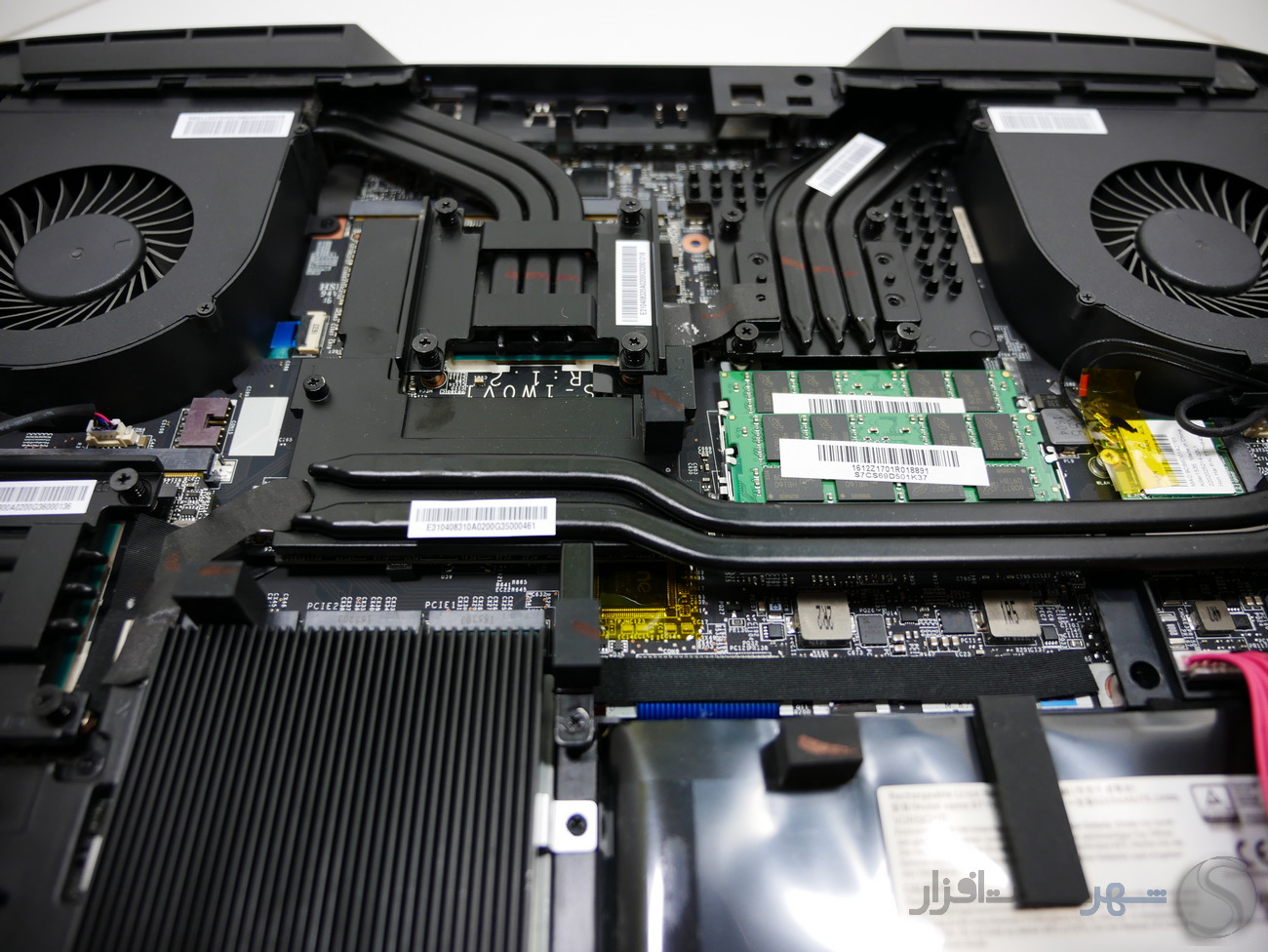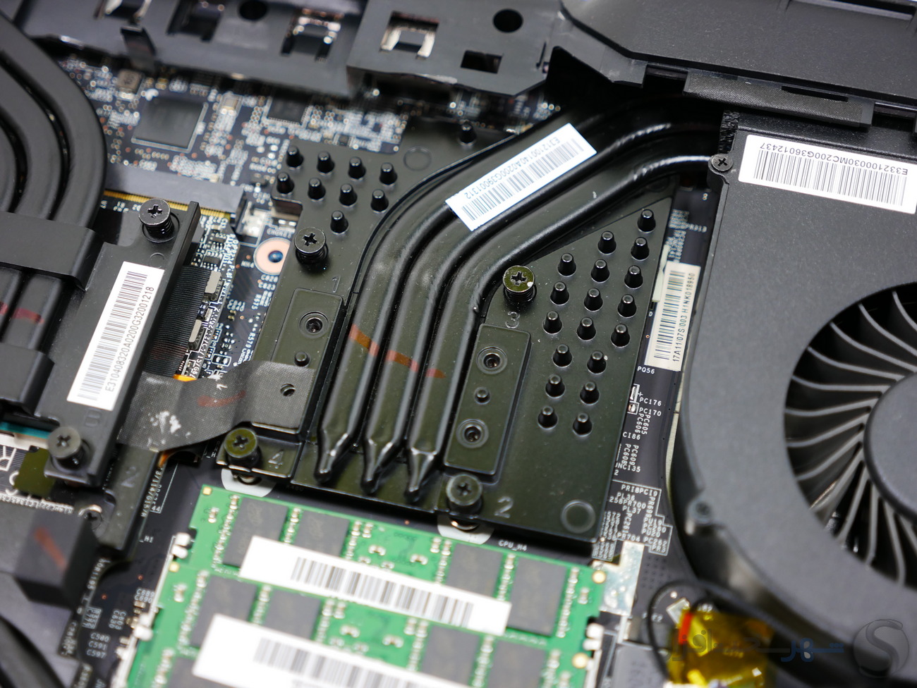 از این 12 لوله مسی، 5 لوله بطور اختصاصی به فن سمت چپ و پردازنده و مابقی بین دو کارت گرافیک 1070 مشترک استفاده شده اند. بدین صورت فن سمت چپ با چرخش پردازنده را خنک می کند و فن سمت راست نیز کارت های گرافیک MXM این لپ تاپ را، البته دو لوله بطور مشترک می توانند گرمای تولید شده کارت های گرافیک را به فن اختصاصی پردازنده نیز هدایت کنند.