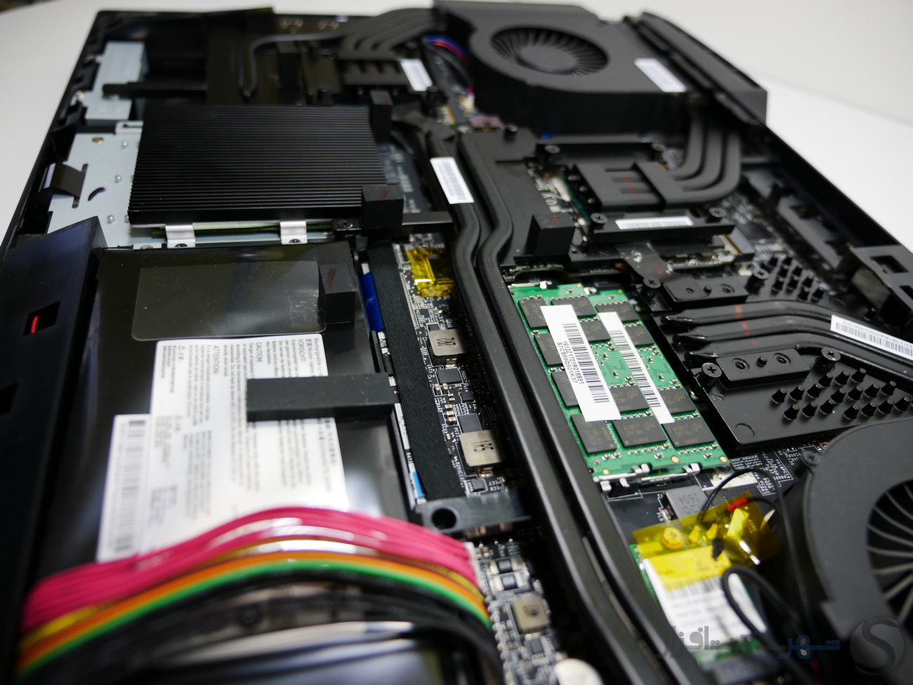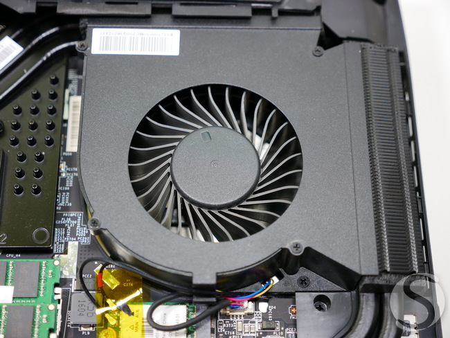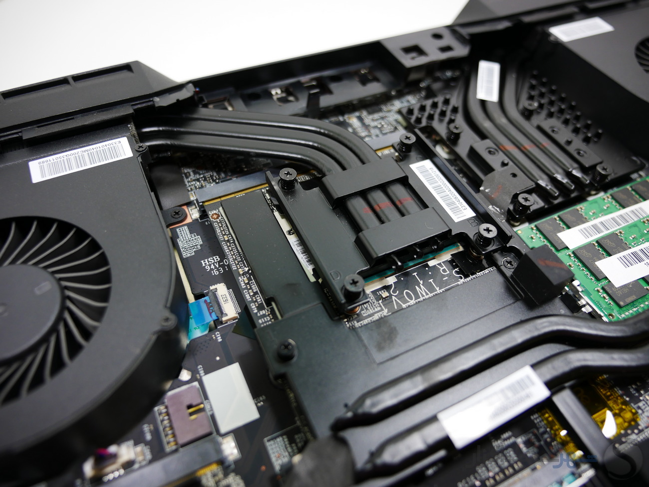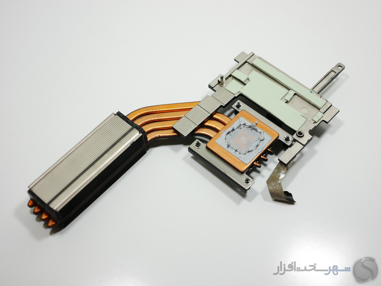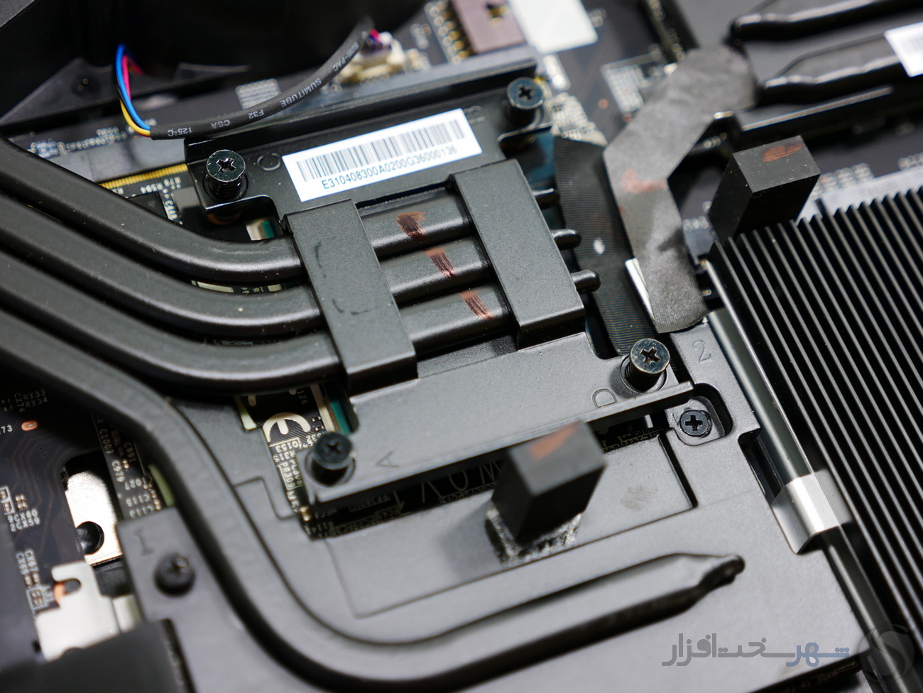 از این 12 لوله مسی، 5 لوله بطور اختصاصی به فن سمت چپ و پردازنده و مابقی بین دو کارت گرافیک 1070 مشترک استفاده شده اند. بدین صورت فن سمت چپ با چرخش پردازنده را خنک می کند و فن سمت راست نیز کارت های گرافیک MXM این لپ تاپ را، البته دو لوله بطور مشترک می توانند گرمای تولید شده کارت های گرافیک را به فن اختصاصی پردازنده نیز هدایت کنند.
