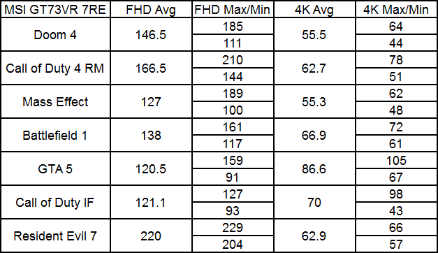 GT73VR 7RE به خوبی می تواند هر گونه بازی را در رزولوشن 4K با نرخ فریمی بسیار مناسب و قابل قبول اجرا کند. در اکثر بازیها در رزولوشن 4K این لپ تاپ نرخ فریمی بالاتر از 60 خواهد داشت.
