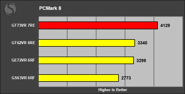 در تست بعدی به سراغ PCMark8 می رویم، این نرم افزار بطور کامل منابع سیستم را محک می زند و به آن نمره ای کلی می دهد. امتیاز فوق العاده 4129 برای GT73VR 7RE به ثبت رسیده است: