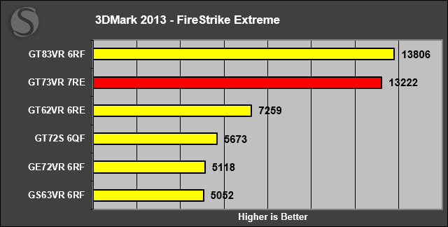 بنچمارک گرافیکی بازی اویل 6 یک محک مناسب برای سنجش توانایی کارت گرافیک در بازیهاست. امتیازی که در آخر بر اساس شمارش فریم ها بدست می آید، رده های A, B, C و S که برترین می باشد را در بر می گیرد. GT73VR 7RE در حالت اورکلاک شده توانست برای رزولوشن 1080 امتیاز 20627 با رنک S و برای رزولوشن 2160 نیز امتیاز فوق العاده 14026 را بدست بیاورد.