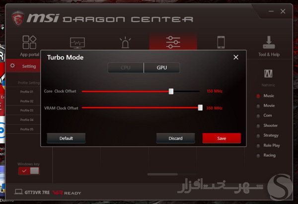 و اما مود دیگری که در GT73VR 7RE قابل دسترسی است، مود Turbo یا حالت اورکلاک است. در این حالت کاربر اجازه پیدا می کند تا پردازنده، کارت های گرافیک و حافظه گرافیکی را تا حداکثر 10 درصد اورکلاک کند.