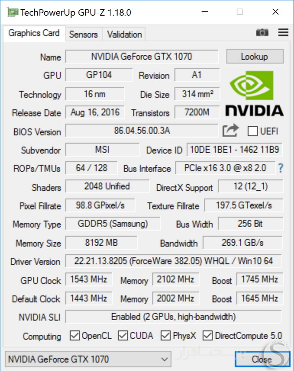 پردازنده گرافیکی: Intel HD Graphics 630 به علاوه دو کارت Nvidia Geforce GTX1070 با 8 گیگابایت حافظه گرافیکی GDDR5
