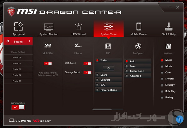 تب مهم دیگر System Tuner است و به شما امکان شخصی سازی و استفاده از قابلیت های مختلف را می دهد. فعال کردن بخش واقعیت مجازی که به لطف استفاده از کارت گرافیک سری 10 جیفورس بدست آمده است، فعال کردن قابلیت X Boost، تنظیم سرعت فن دستگاه در حالت های مختلف و همچنین دسترسی به پروفایل های Shift و حتی پروفایل های رنگ اپلیکیشن True Color. درباره قابلیت های X Boost، Shift و ... در صفحه سخت افزار و بنچمارک ها بیشتر صحبت خواهیم کرد.