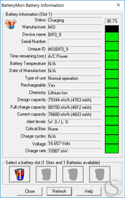 GT73VR 7RE به یک باتری داخلی 8 سلولی با ظرفیت اسمی 5225 میلی آمپر و توان اسمی 75 وات بر ساعت بر اساس ولتاژ ثابت 14.4 ولتی مجهز است، اگرچه این میزان ظرفیت در واقعیت اندکی کمتر بوده اما تفاوت زیادی در نتیجه نخواهد داشت.