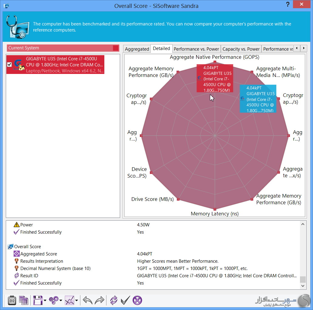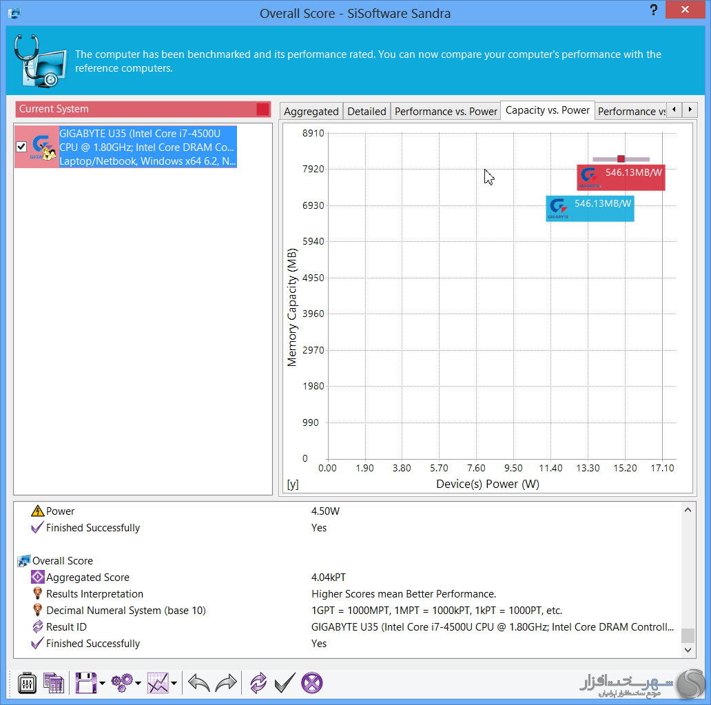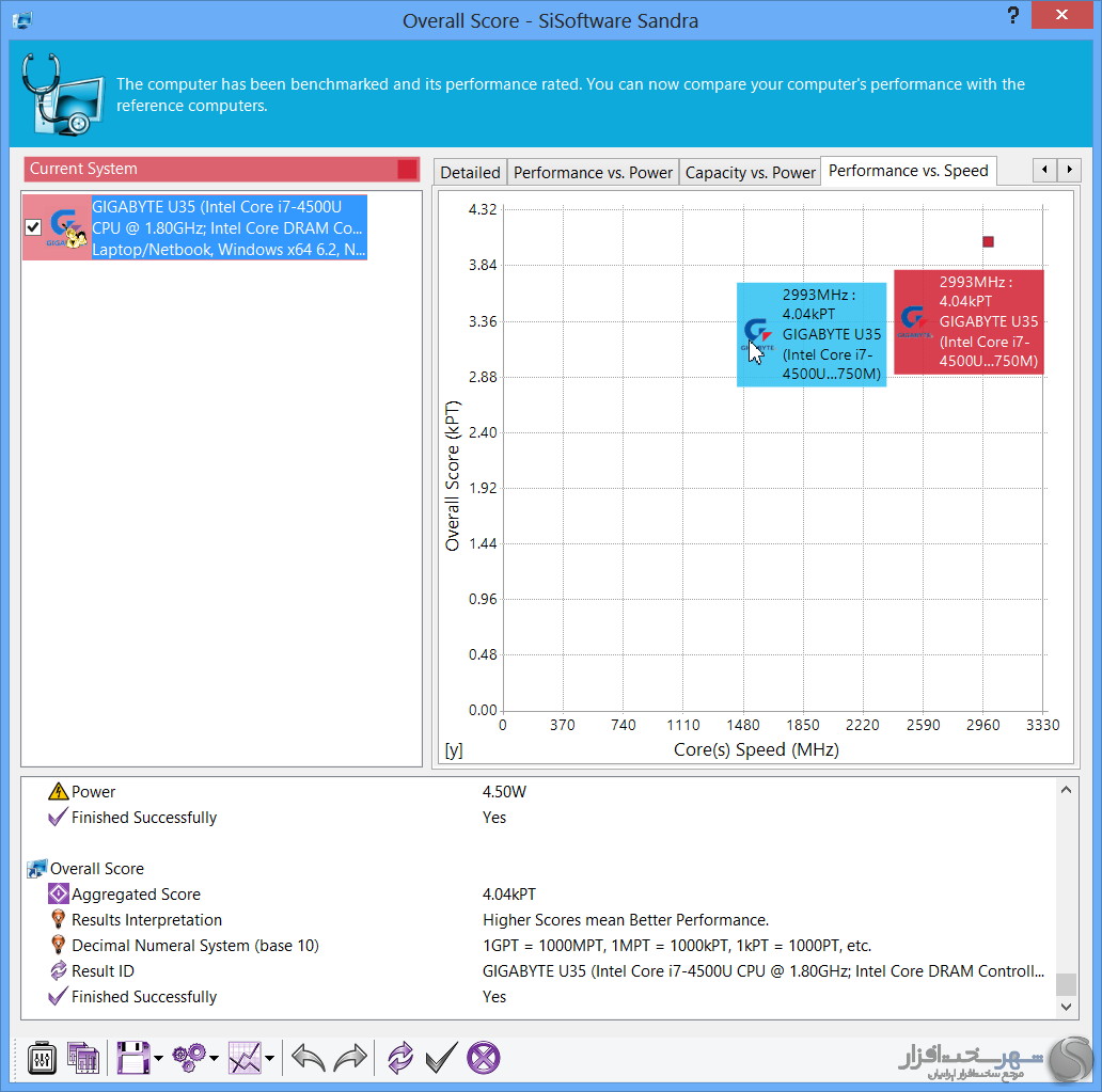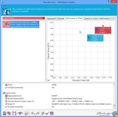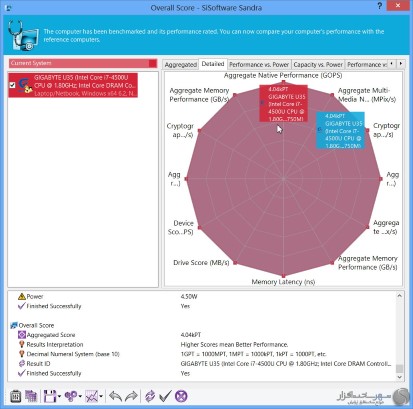 نرم افزار مشهور SiS Sandra نیز الگوریتم و بنچمارک مخصوص به خود را دارد و به علت اجرا نشدن PC Wizard 2013 ما تصمیم به جایگزینی آن با SiS Sandra گرفتیم، نتایج تست این نرم افزار به شرح زیر می باشد:
