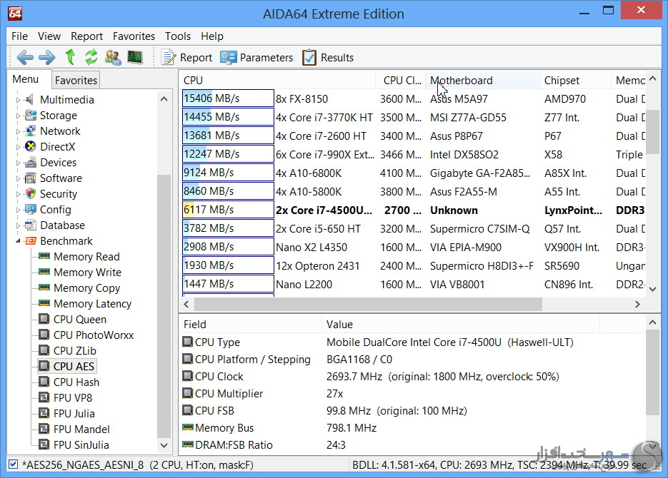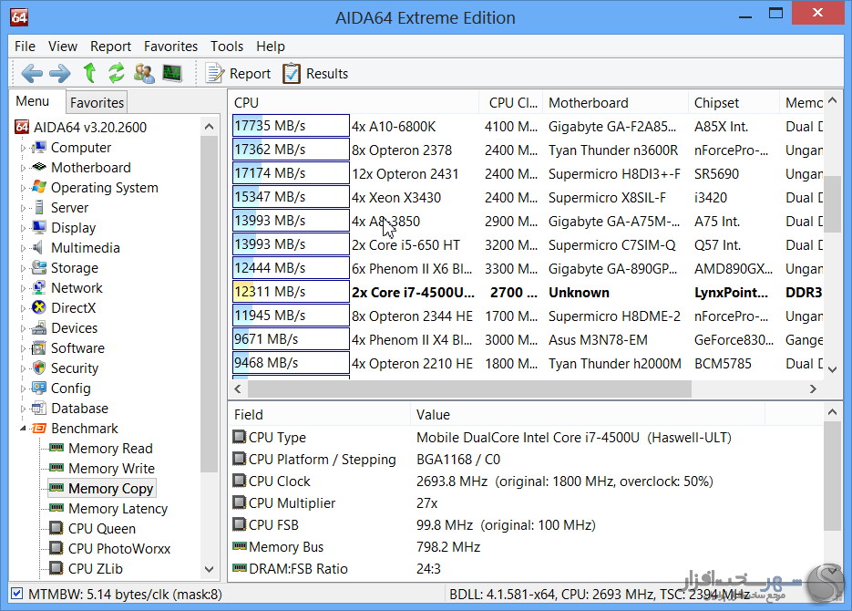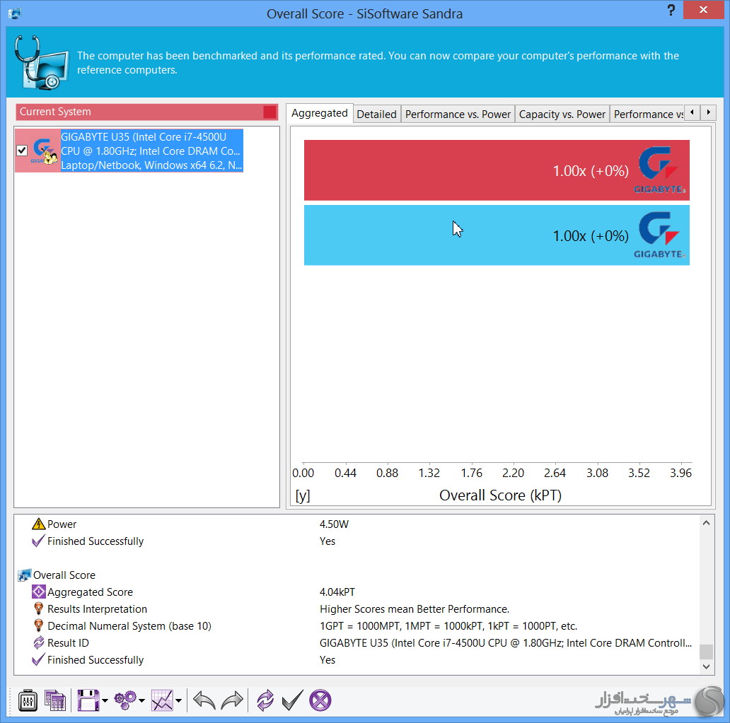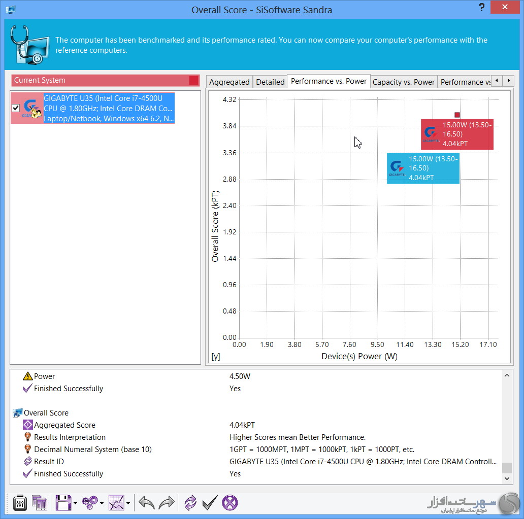 نرم افزار مشهور SiS Sandra نیز الگوریتم و بنچمارک مخصوص به خود را دارد و به علت اجرا نشدن PC Wizard 2013 ما تصمیم به جایگزینی آن با SiS Sandra گرفتیم، نتایج تست این نرم افزار به شرح زیر می باشد: