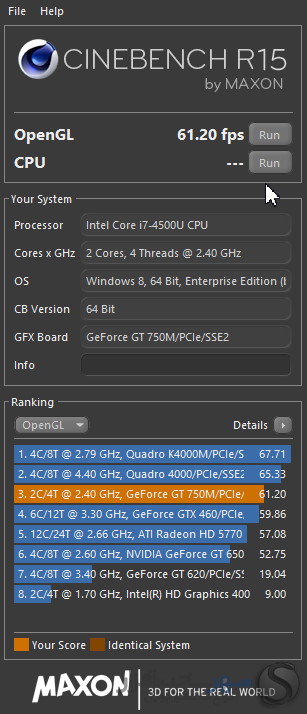 پردازنده U35F توانسته در تست CPU امتیاز 261cb را کسب کند که برای یک اولترابوک بسیار مناسب است، همچنین در تست OpenGL نیز کارت گرافیک GT750M توانسته 61.20 فریم امتیاز را به ثبت برساند.