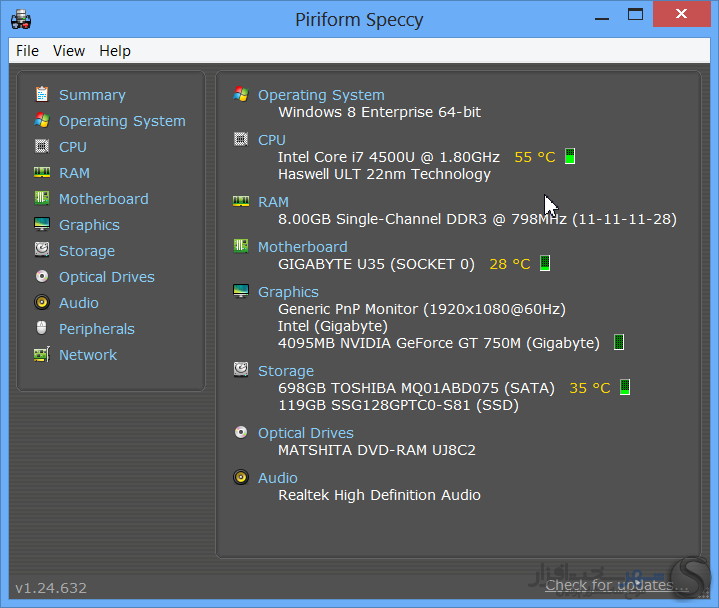 صفحه اطلاعات برنامه Speecy نیز بدین شرح می باشد: