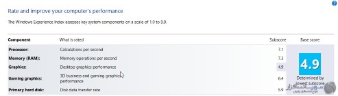 Windows Experience Tool نیز یک معیار مناسبی برای سنجش کلی سخت افزار می باشد که برای اکثر کاربران شناخته شده است و می تواند به خوبی شرایط مقایسه را فراهم کند. همانگونه که مشاهده می شود U35F با کسب نمره 4.9 برای پایین ترین بخش که Graphics است این تست را به پایان رسانده است، در سیستم نمره دهی ویندوز هارد دیسک 750 گیگابایتی به عنوان حافظه ذخیره سازی اول انتخاب شده است و امتیازی بابت حافظه SSD در نظر نگرفته شده است.