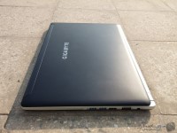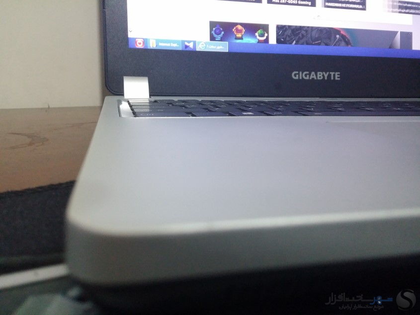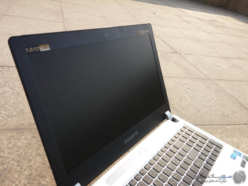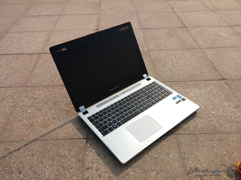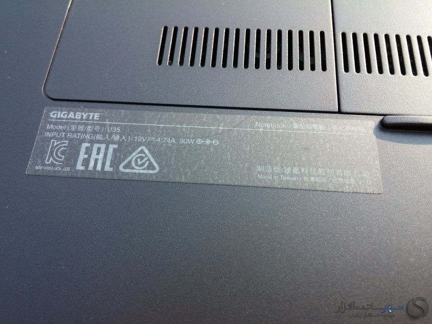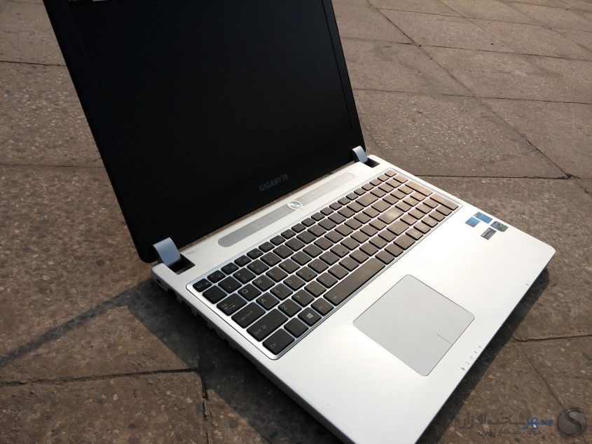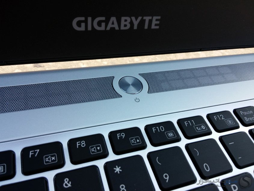 در پشت و بالاتر از مرکز قاب لوگوی GIGABYTE خودنمایی می کند. برای باز کردن نمایشگر و دسترسی به کیبورد و تاچ پد نیاز به انرژی زیادی نیست و با کمی فشار به سمت بالا نمایشگر به راحتی باز می شود. بر روی سطح رویی غیر از کیبورد و تاچ پد تنها کلید پاور مشاهده می شود. در سمت راست دستگاه دو پورت USB 3.0، پورت HDMI، پورت VGA و ورودی شارژر قرار داده شده است و در سمت چپ نیز دو پورت USB 2.0، جک هدفون و میکروفون، اسلات کارت حافظه، پورت LAN گیگابیتی و پورت امنیتی Kensington تعبیه گشته است. در جلوی دستگاه نیز درایو DVD به همراه LED های مربوط به قابلیت های ارتباطی و باتری وجود دارد. ضمناً کلید انحصاری در کنار درایو DVD تعبیه شده است تا زمانی که U35F در وضعیت Standby قرار دارد بتوانید با فشار دادن آن میزان شارژ داخلی باتری را بر روی پنج LED تعبیه شده مشاهده کنید.