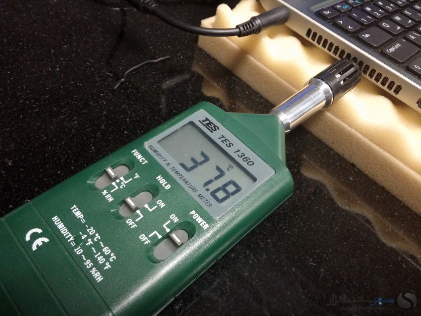 در بررسی دمای تولید شده توسط U35F ما نیز همانند روال گذشته 9 قسمت از بدنه اصلی را به وسیله Thermometer در وضعیت پشت و رو و همچنین حالت کاری Idle و Load بررسی کردیم، همچنین دمای هوای خروجی را نیز در دو حالت Load و Idle اندازه گرفتیم که بدین شرح بر روی دو تصویر زیر قابل مشاهده است، باید به اطلاع برسانیم دمای اطاق محل تست 26.5 درجه سانتی گراد بوده و میزان رطوبت نیز 20 درصد ثبت گردیده است.