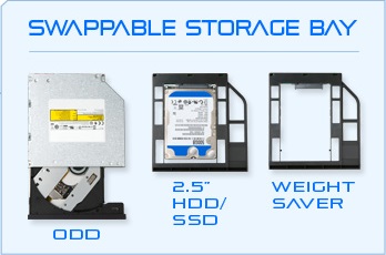 این درایو قابلیت تعویض سریع داشته و به کمک یک ضامن نگه دارنده در زیر بدنه می توان آن را جدا نمود و با هارد داخلی یا یک قاب خالی به جهت کاهش وزن اولترابوک تعویض کرد. اطلاعات بیشتر را می توانید در این لینک مشاهده کنید.