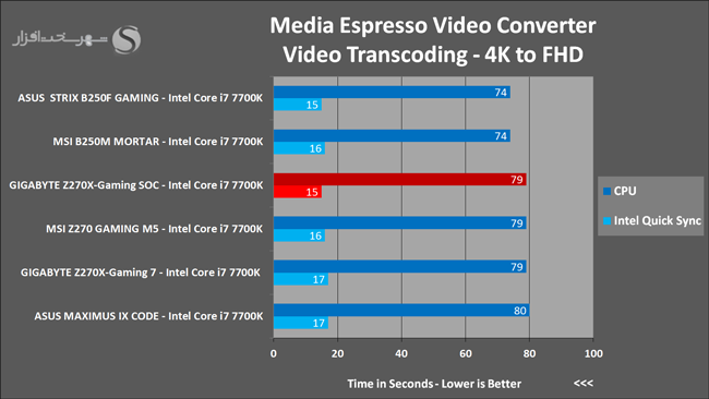 در نرم افزار CyberLink MediaEspresso از توان CPU و تراشه گرافیکی مجتمع (IGP) برای تبدیل یک فایل ویدئویی باکیفیت 2160p با فرمت MP4 و کمک AVC1 با حجم 481MB به استاندارد ویدئویی 1920x1080 در Youtube استفاده شده است.