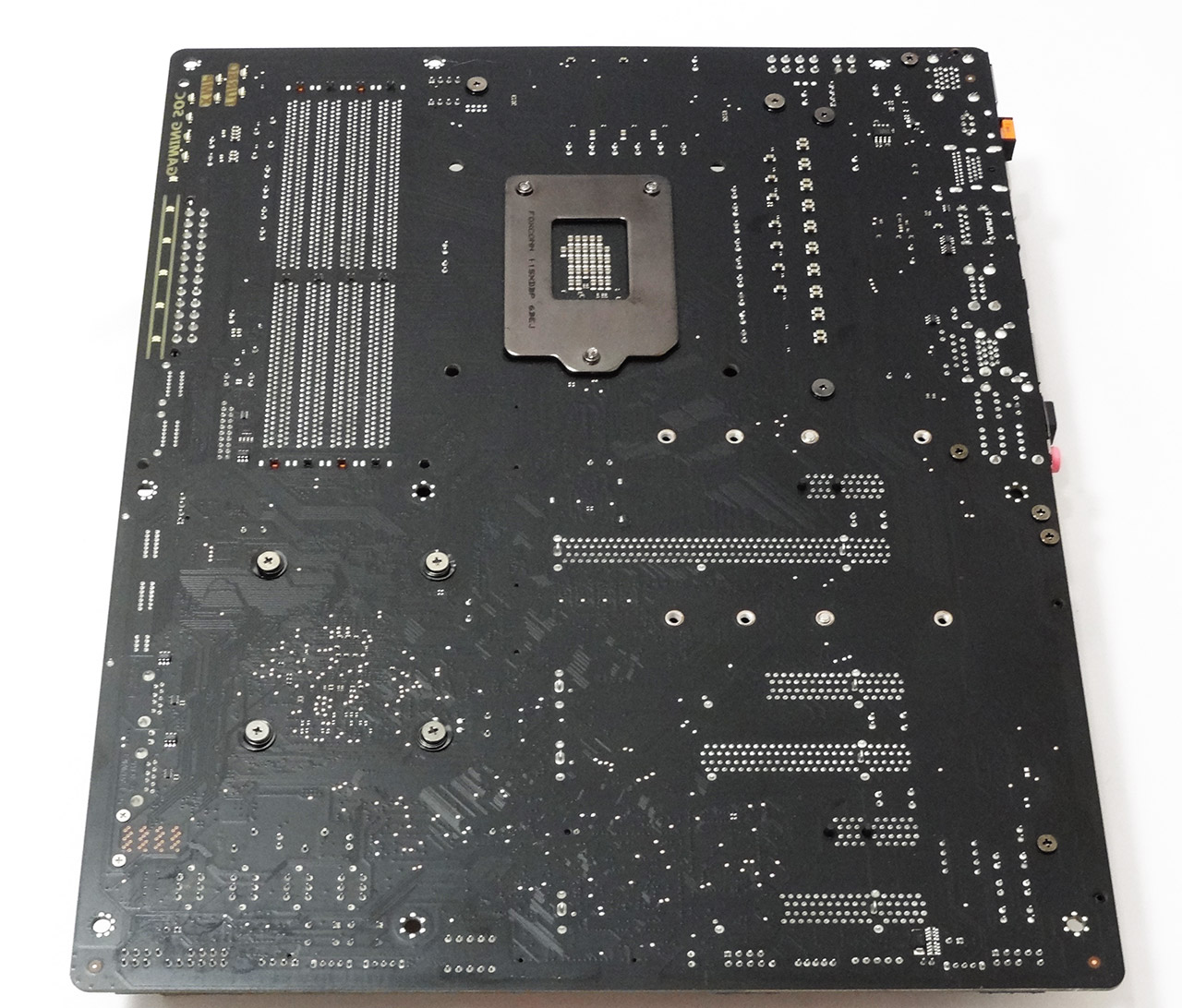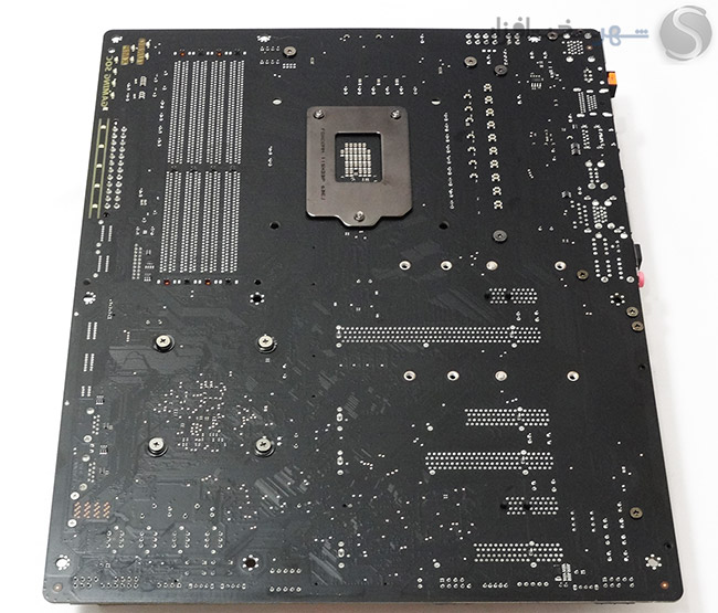 کیفیت لحیمکاری PCB مثل همیشه عالی است و با یک نگاه به PCB کاملاً مشکیرنگ این مادربرد میتوان به این موضوع پی برد. در پشت PCB هیچ خبری از تعبیه تسمه فلزی برای تثبیت بیشتر هیت سینکها و یا دفع حرارت از برخی کامپوننت های مدار رگولاتور ولتاژ پردازنده نیست و تمامی بخشهای نصب شده بر روی PCB اعم از هیت سینکها و پوششهای پلاستیکی توسط 13 عدد پیچ فنردار و یا معمولی بر روی این PCB نصب شدهاند.