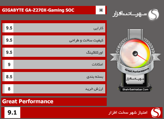 با تمامی این تفاسیر مادربرد "GIGABYTE Z270X-Gaming SOC" موفق به کسب امتیاز ممتاز 9.1 و نشان "Great Performance" و ریز امتیازات زیر در کلاس محصولات (H (High-End از لابراتوار شهرسختافزار شد.
