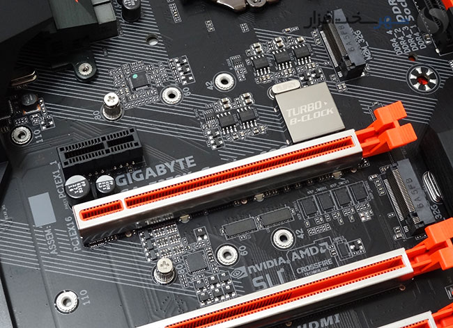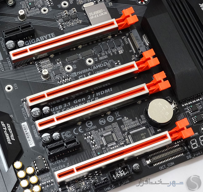 علاوه بر این، 2 اسلات PCI-Express 3.0 X1 منشعب شده از چیپست Intel Z270 نیز در بین اسلات های X16 تعبیه شدهاند تا برای نصب تجهیزات جانبی محدودیت خاصی وجود نداشته باشد.