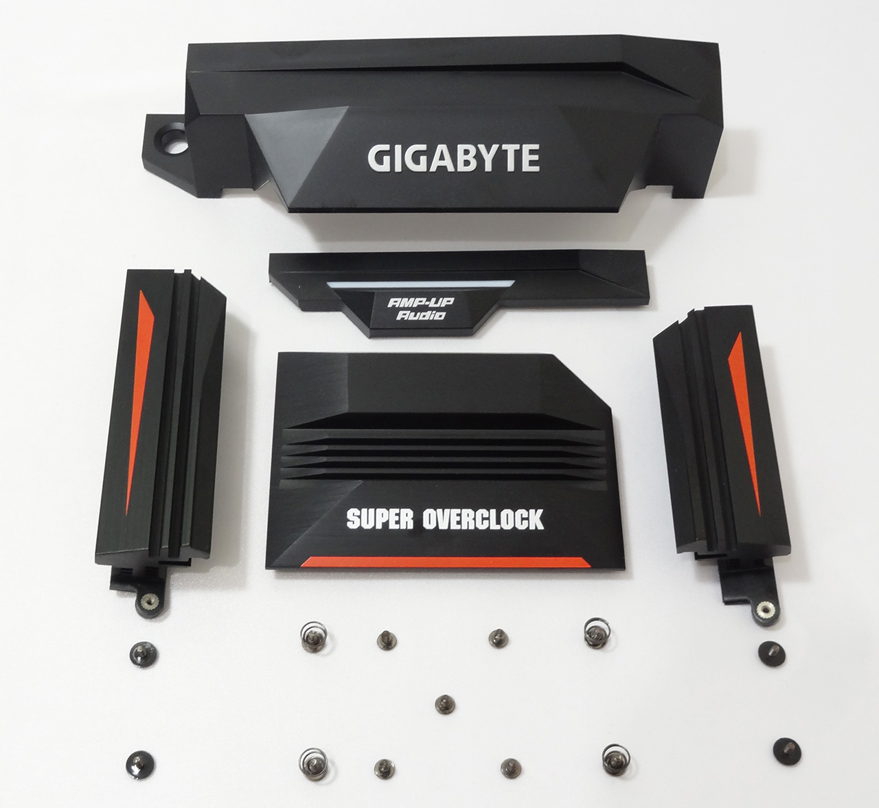 در تصاویر بالا PCB برهنه این مادربرد به همراه هیت سینکهای سیستم خنککننده و 13 پیچ برای نصب آنها بر روی PCB و در کنار آنها نیز پوششهای پلاستیکی تعبیه شده بر روی پورتهای سیستم صوتی و پورتهای پنل پشتی مادربرد را ملاحظه میکنید. ابعاد و وزن هیت سینکها مشابه مادربردهای میان رده در نظر گرفته شده است.