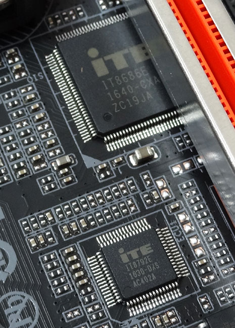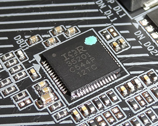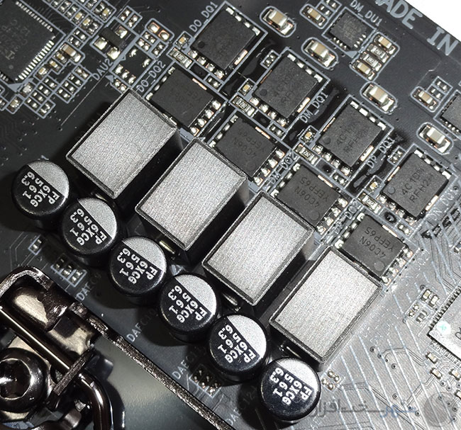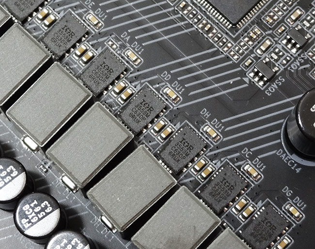 کمپانی گیگابایت در این بخش همانند سایر مادربردهای ردهبالای خود از تراشههای مجتمع مبتنی بر استاندارد DrMOS V4.0 کمپانی اینتل استفاده کرده است. در این استاندارد ماسفت های Low-Side، High-Side و درایور به همراه مدارات محافظ همگی در یک پکیج مجتمع شدهاند و شرایط بسیار سختگیرانهای برای رنج ولتاژهای ورودی و خروجی، حداقل جریان DC خروجی بهصورت پیوسته و حداقل فرکانس سوئیچینگ در نظر گرفته شده است. ماسفت های به کار رفته در این مدار مدل IR3553 ساخت کمپانی مطرح International Rectifier هستند. این تراشهها که نسل سوم Integrated PowIRstage های ساخت این کمپانی محسوب میشوند دارای مشخصات فنی بسیار ممتازی میباشد که از مهمترین آنها میتوان به پشتیبانی از فرکانس سوئیچینگ تا 1MHz، حداکثر بازدهی مصرف انرژی بیش از 93% و توانایی تحمل بیش از 40A جریان DC بهصورت پیوسته اشاره کرد.