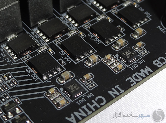 کنترل و مدیریت تمامی فعل و انفعالات صورت گرفته در این بخش نیز توسط تراشه Digital Multi-Phase Controller مدل IR35201 ساخت کمپانی آمریکایی Infineon صورت میگیرد. از جمله ویژگیهای این تراشه 8Phase که البته در این مدار بهصورت 2Phase فعال شده است میتوان به پشتیبانی از پروتکشن های OVP, UVP, OCP, OTP, CFP و فرکانس سوئیچینگ تا 2MHz اشاره کرد.