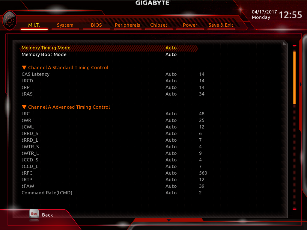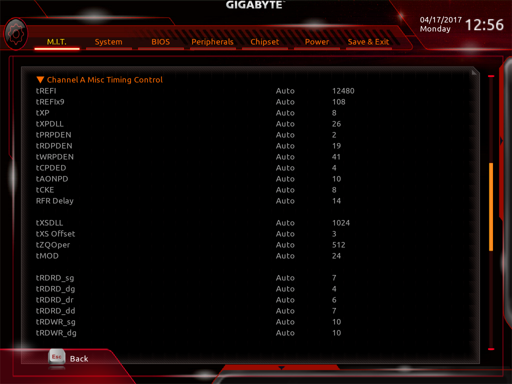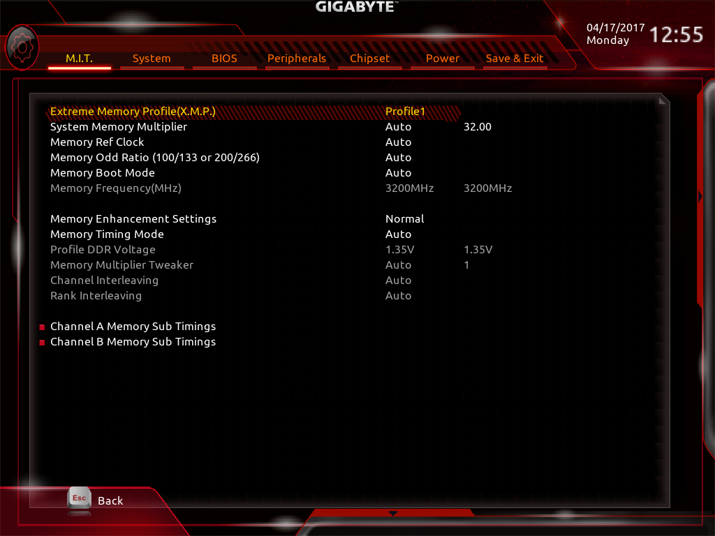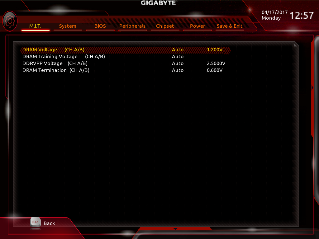 صفحه Advanced DDR OC نیز حاوی پارامترهایی نظیر ضریب فرکانس ماژولهای حافظه RAM، قابلیت فعال سازی پروفایلهای XMP و تایمینگ های اصلی و Advanced برای اورکلاک حافظههای RAM است.