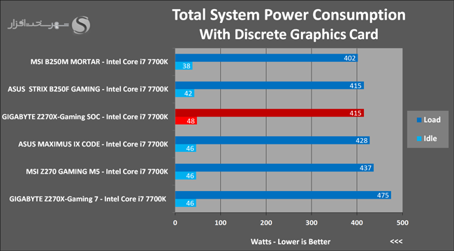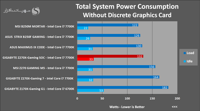 در این بخش توان مصرفی کل سیستم را (توان مصرفی از برق شهر توسط پاور سیستم) توسط دستگاه وات متر دیجیتال در دو وضعیت با کارت گرافیک مجزا و بدون کارت گرافیک مجزا در دو حالت Idle (15 دقیقه بدون هیچ گونه فعل و انفعال) و در حالت Load کامل CPU و GPU (بهواسطه 15 دقیقه اجرای هم زمان تست CPU: OCCT و تست Burn-in نرم افزار FurMark) اندازه گیری کردیم. نتیجه به دست آمده به شرح زیر است: