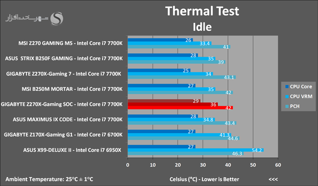 در تستهای حرارتی نیز همانطور که ملاحظه میکنید هیت سینکها، پدها، چسبها و خمیرهای حرارتی مرغوب، استفاده از قطعات باکیفیت و مدرن در مدارهای رگولاتور ولتاژ پردازنده و ماژولهای حافظه و از همه مهمتر بهینه سازیهای انجام شده در Bios همگی در عمل باعث ثبت چنین نتیجه بینظیر و تحسین برانگیزی شدهاند. درواقع همانطور که قبلاً نیز بارها به این موضوع اشاره شده است، مادربردهای با بازدهی انرژی بالا و تلفات انرژی حداقل، معمولاً در تستهای حرارتی نیز عملکرد فوقالعاده و ممتازی خواهند داشت.