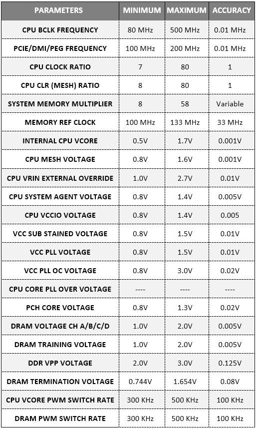 همچنین اینتل امکان تغییر نسبت آفست AVX-512 را اضافه کرده که یک قابلیت سودمند برای دست یابی به اورکلاک های بالاتر تحت بنچ مارکهای غیر AVX است. این کمپانی نه تنها قابلیت تقلیل و ثابت نگه داشتن (Trim) ولتاژ کنترلر حافظه را اضافه کرده، بلکه شاهد بازگشت قابلیت اورکلاکینگ PEG (PCIe) و DMI هستیم. قابلیت اورکلاک کردن DMI بهطور ویژه در عبور از محدودیتهای پهنای باند سودمند است. همچنین اینتل طرحهای گارانتی قابل انتخاب برای پردازندههای خود را یک مرحله دیگر گسترش داده و حالا میتوان طرح گارانتی با پوشش خرابیهای ناشی از اورکلاکینگ را نیز انتخاب کرد.
