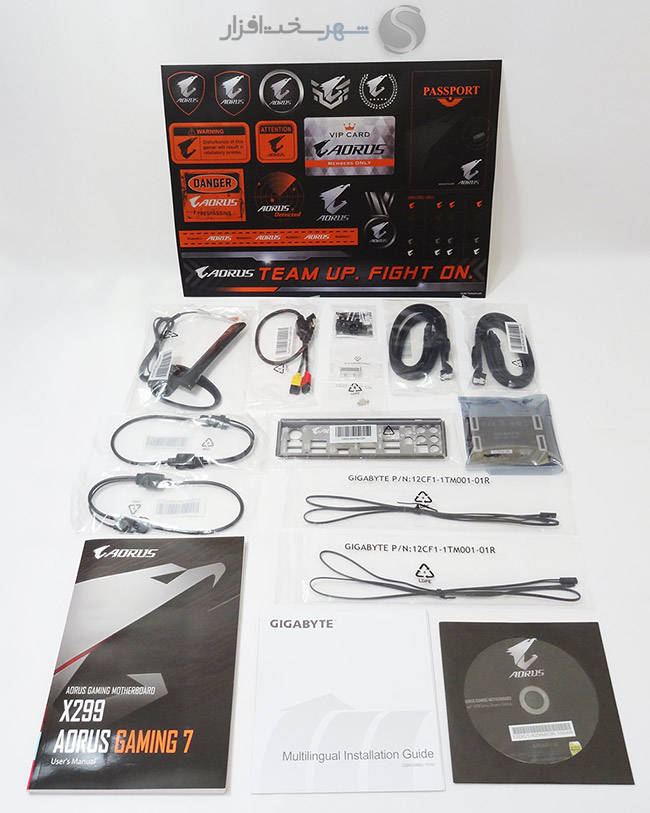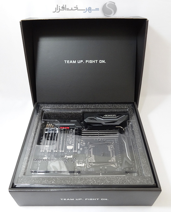 با باز کردن جعبه با شعار برند AORUS یعنی TEAM UP FIGHT ON و مادربرد که زیر یک پوشش شفاف پلاستیکی و در میان پوشش نرم اسفنجی آرام گرفته است روبرو خواهید شد.