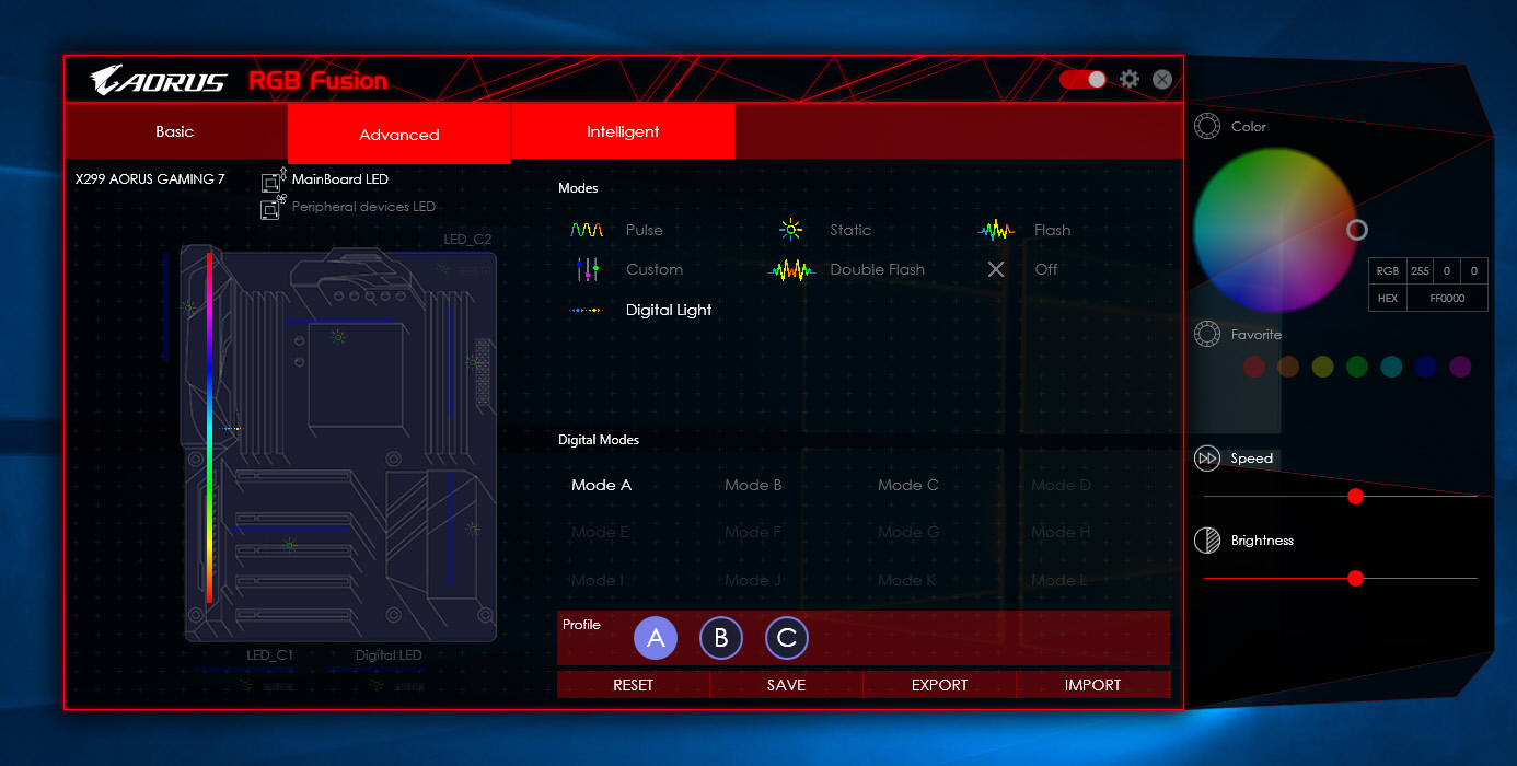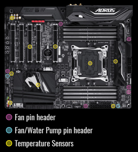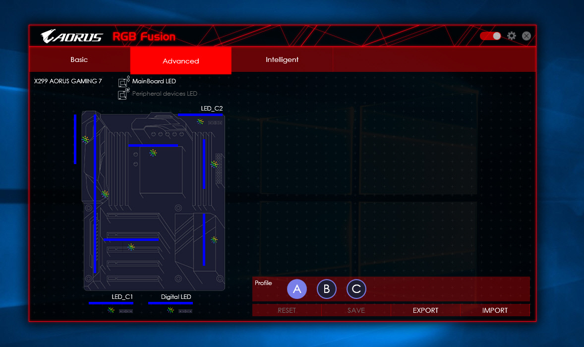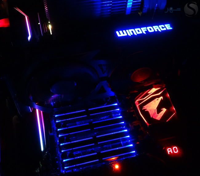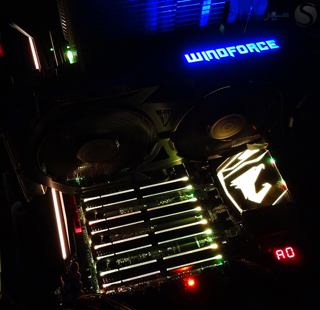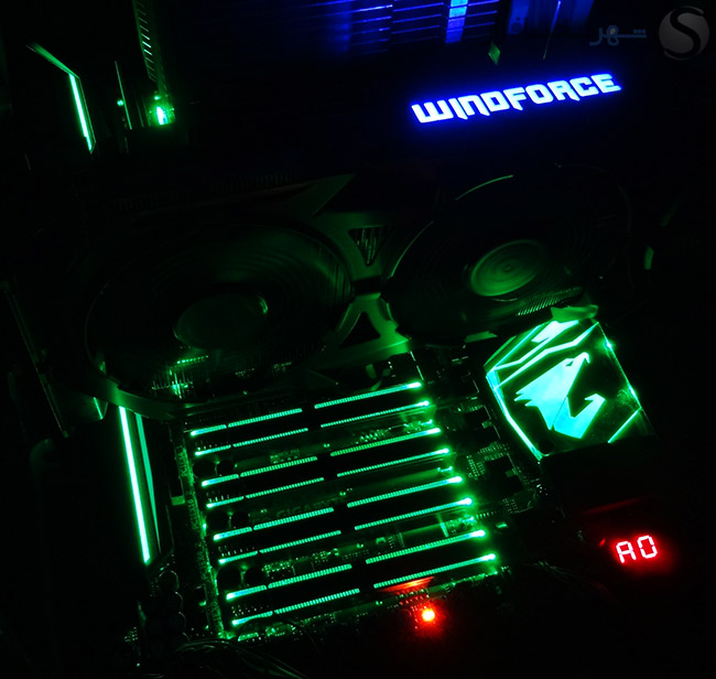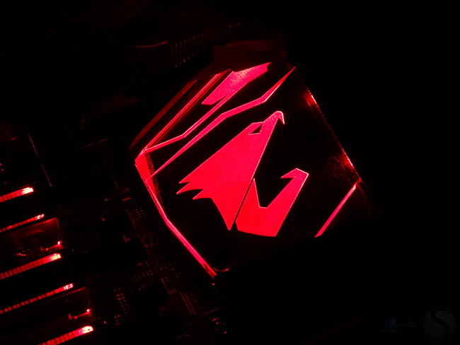 همانند اغلب مادربردهای رده بالا و جدید، کمپانی GIGABYTE این مدل را نیز به سامانه نورپردازی با RGB LED تحت عنوان RGB FUSION مجهز کرده است. این LED ها همانطور که در تصویر بالا ملاحظه میکنید در پشت هیتسینک چیپست PCH، اسلات های توسعه، در میان تمامی DIMM های حافظه و پنل تعبیه شده بر روی قطعات سیستم صوتی و پورتهای پنل پشتی تعبیه شدهاند.