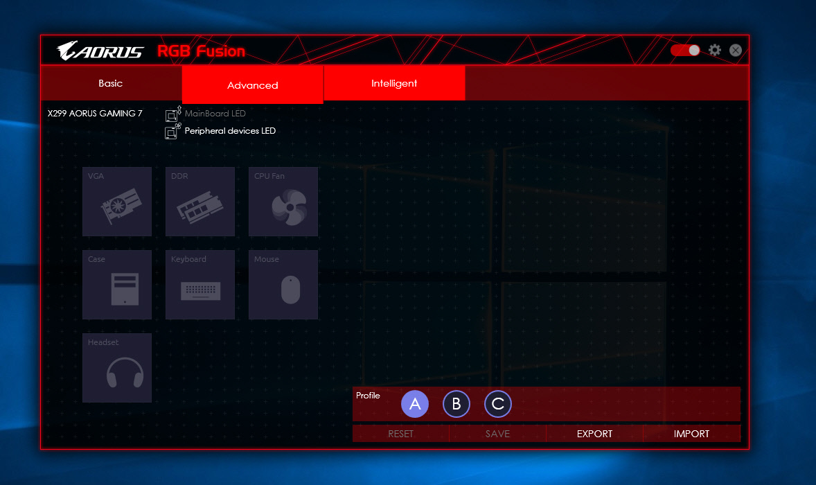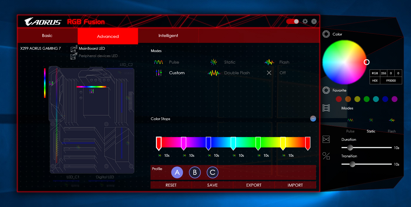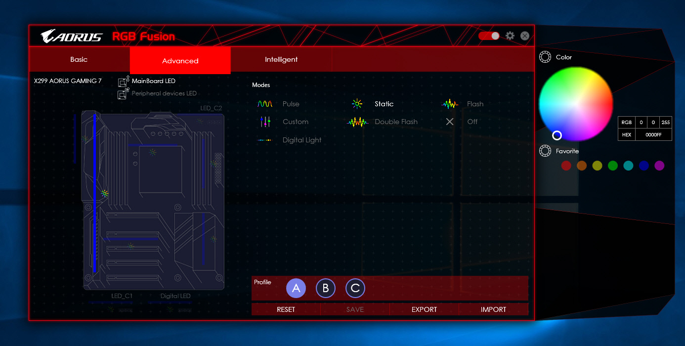 همانند اغلب مادربردهای رده بالا و جدید، کمپانی GIGABYTE این مدل را نیز به سامانه نورپردازی با RGB LED تحت عنوان RGB FUSION مجهز کرده است. این LED ها همانطور که در تصویر بالا ملاحظه میکنید در پشت هیتسینک چیپست PCH، اسلات های توسعه، در میان تمامی DIMM های حافظه و پنل تعبیه شده بر روی قطعات سیستم صوتی و پورتهای پنل پشتی تعبیه شدهاند.