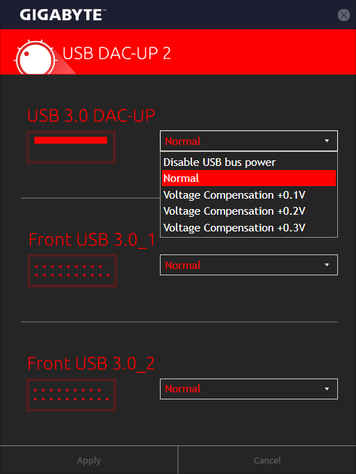 همانطور که اشاره شد یکی از قابلیتهای بینظیر این مادربرد USB DAC-UP 2 و قابلیت تنظیم سطح ولتاژ 5V پورتهای USB 3.0 زرد رنگ تعبیه شده در پنل پشتی و Header های تعبیه شده بر روی PCB میباشد. نرم افزار USB DAC-UP 2 دقیقاً برای همین منظور کاربرد دارد.