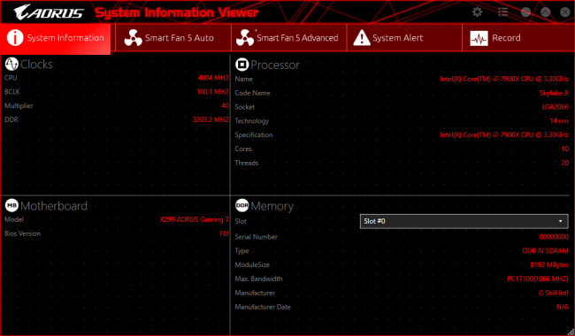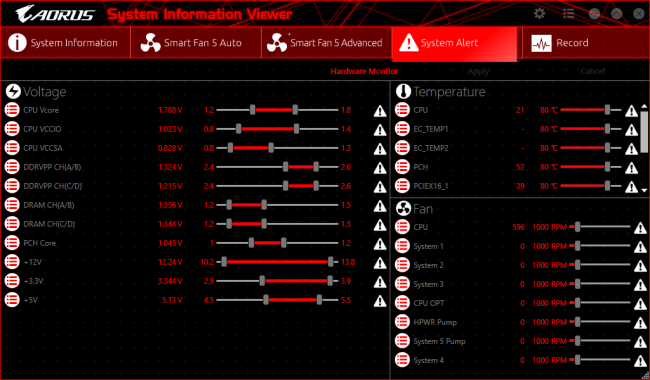 در بخش System Alert تمهیداتی اندیشه شده تا در صورت خارج شدن پارامترهای مختلف ولتاژی، حرارتی و حتی سرعت چرخش فنها از محدوده تعیین شده، سیستم هشدار دهنده این نرم افزار کاربر را از مشکل به وجود آمده باخبر سازد. محدوده امن تمامی پارامترها بهصورت پیش فرض تنظیم شدهاند، اما این امکان فراهم شده تا کاربر نیز توانایی تغییر این محدودهها را داشته باشد.