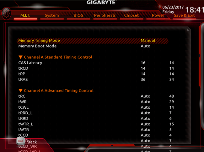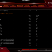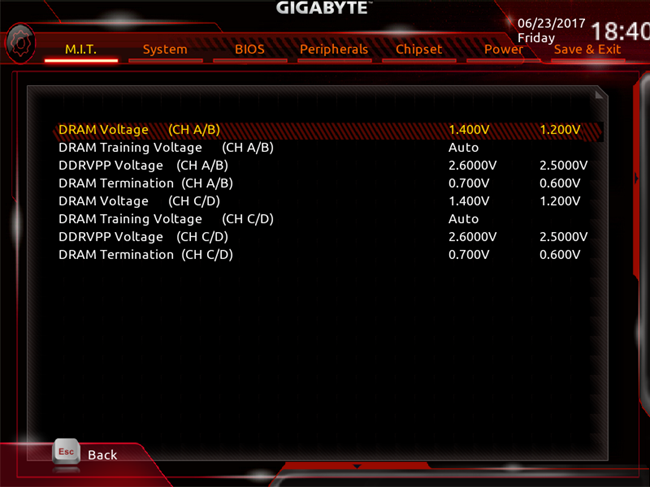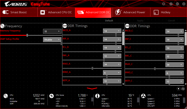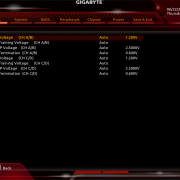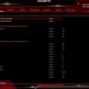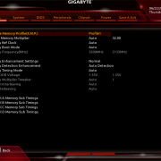 صفحه Advanced DDR OC نیز حاوی پارامترهایی نظیر ضریب فرکانس ماژولهای حافظه RAM، قابلیت فعال سازی پروفایلهای XMP و تایمینگ های اصلی و Advanced برای اورکلاک حافظههای RAM است.