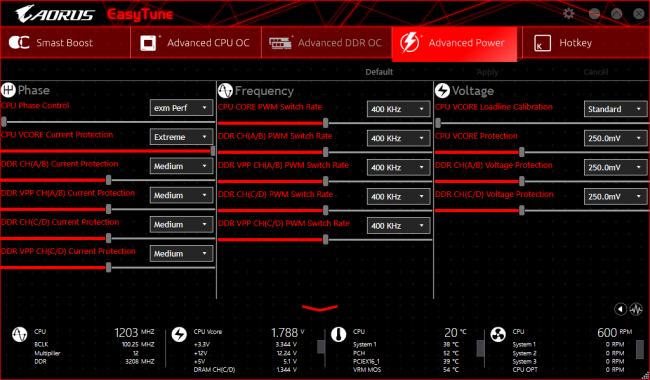 پارامترهای مربوط به مدارات کنترل مصرف انرژی، فرکانس سوئیچینگ مدارات PWM و پروتکشن های در نظر گرفته شده برای CPU، ماژولهای حافظه RAM نیز در پنجره Advanced Power این نرم افزار گنجانده شدهاند.
