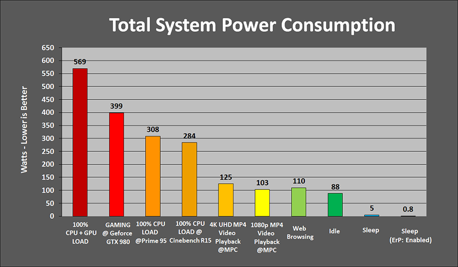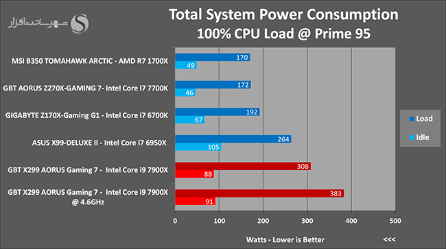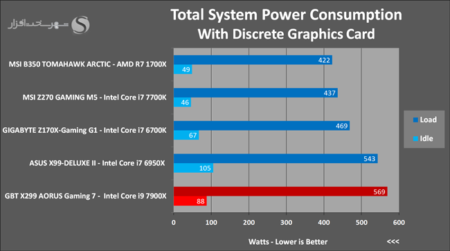 در این بخش توان مصرفی کل سیستم را (توان مصرفی از برق شهر توسط پاور سیستم) توسط دستگاه وات متر دیجیتال در دو وضعیت با کارت گرافیک مجزا و بدون کارت گرافیک مجزا در دو حالت Idle (15 دقیقه بدون هیچ گونه فعل و انفعال) و در حالت Load کامل CPU و GPU (بهواسطه 15 دقیقه اجرای هم زمان تست CPU: OCCT و تست Burn-in نرم افزار FurMark) اندازه گیری کردیم. نتیجه به دست آمده به شرح زیر است:آنچه در نگاه اول مشخص است کاهش حدوداً 20% مصرف انرژی این پلتفرم در حالت بیباری (Idle) در مقایسه با پلتفرم مشابه نسل قبل یعنی مادربردهای مبتنی بر چیپست Intel X99 و پردازنده Intel Core i7 6950X است. علت این امر را میتوان کاهش محسوس کنترلرهای جانبی تعبیه شده در مادربردهای نسل جدید به دلیل افزایش منابع ذاتی چیپست Intel X299 توصیف کرد؛ اما با این حال مصرف انرژی در حالت Load کامل، اندکی افزایش یافته است. این در حالی است که به گفته اینتل توان مصرفی هر دو پردازنده مشابه در دو نسل قدیم و جدید 140W ذکر شده است. تنها دلایلی که میتوانند باعث ثبت این نتیجه شده باشند به بلوغ نرسیدن Bios مادربرد AORUS X299 GAMING 7 در تنظیمات بهینه سازی نشده P-State پردازنده باشد.