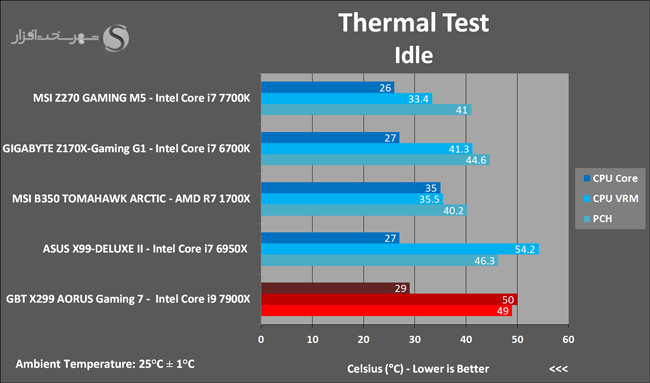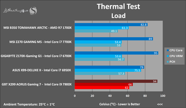 اما با وجود مصرف بسیار بالای پردازنده، عملکرد مدار رگولاتور ولتاژ و سیستم خنک کننده مادربرد در این بخش تحسین برانگیز است! دلیل اصلی این امر نیز بازدهی مصرف انرژی بسیار بالا مدار رگولاتور ولتاژ پردازنده این مادربرد است. همچنین علیرغم هیتسینک نسبتاً بزرگ و سنگینی که در AORUS X299 GAMING 7 برای چیپست Intel PCH X299 در نظر گرفته شده است نتایج ثبت شده کمی دورتر از انتظارات ما است.